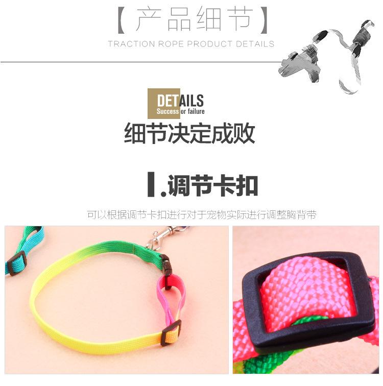 4. Corda de tração de corda redonda colorida com peito e costas: largura da corda 1,0 cm comprimento 120 cm peito e largura das costas 1,5 cm circunferência do peito ajustável 30 ~ 45 cm