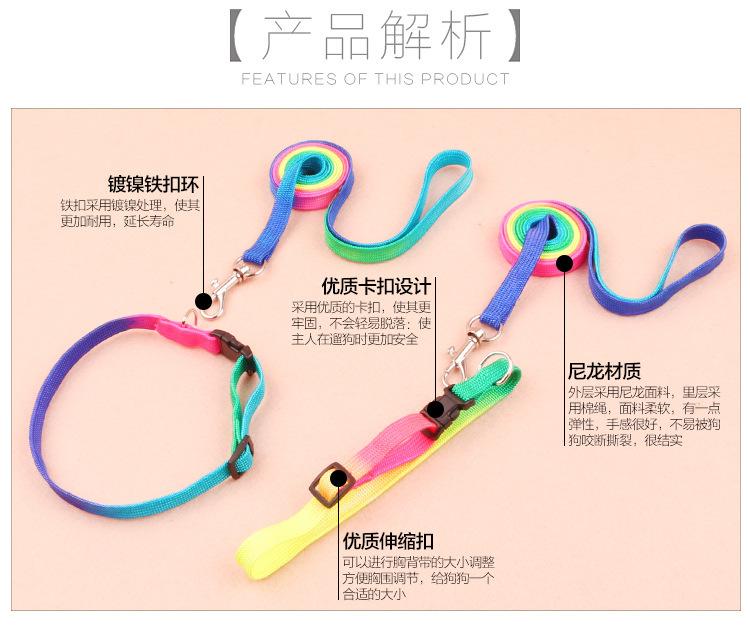 1. Corda de tração de corda plana colorida com peito e costas: largura da corda 1,0 cm comprimento 120 cm peito e largura das costas 1,0 cm circunferência do peito ajustável 25 ~ 40 cm