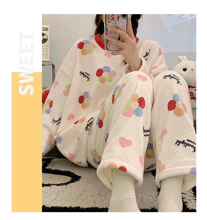 Pijamas de outono e inverno femininos, ternos grossos de flanela coral, lã fofa, forrado de lã, quente, solto, gola redonda, roupa externa para casa