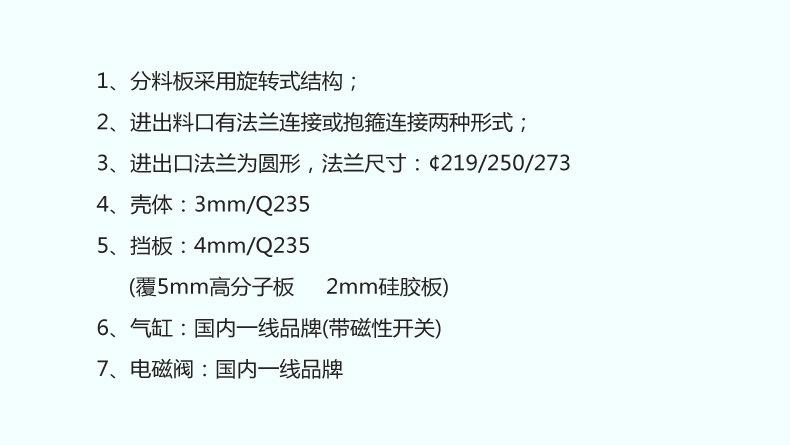 Distribuidor de três vias, descargaVálvula de material:Aplicável ao controle de fluxo de materiais em rações, farinha, alimentos, produtos químicos, mineração, metalurgia, cimento e outras indústrias;