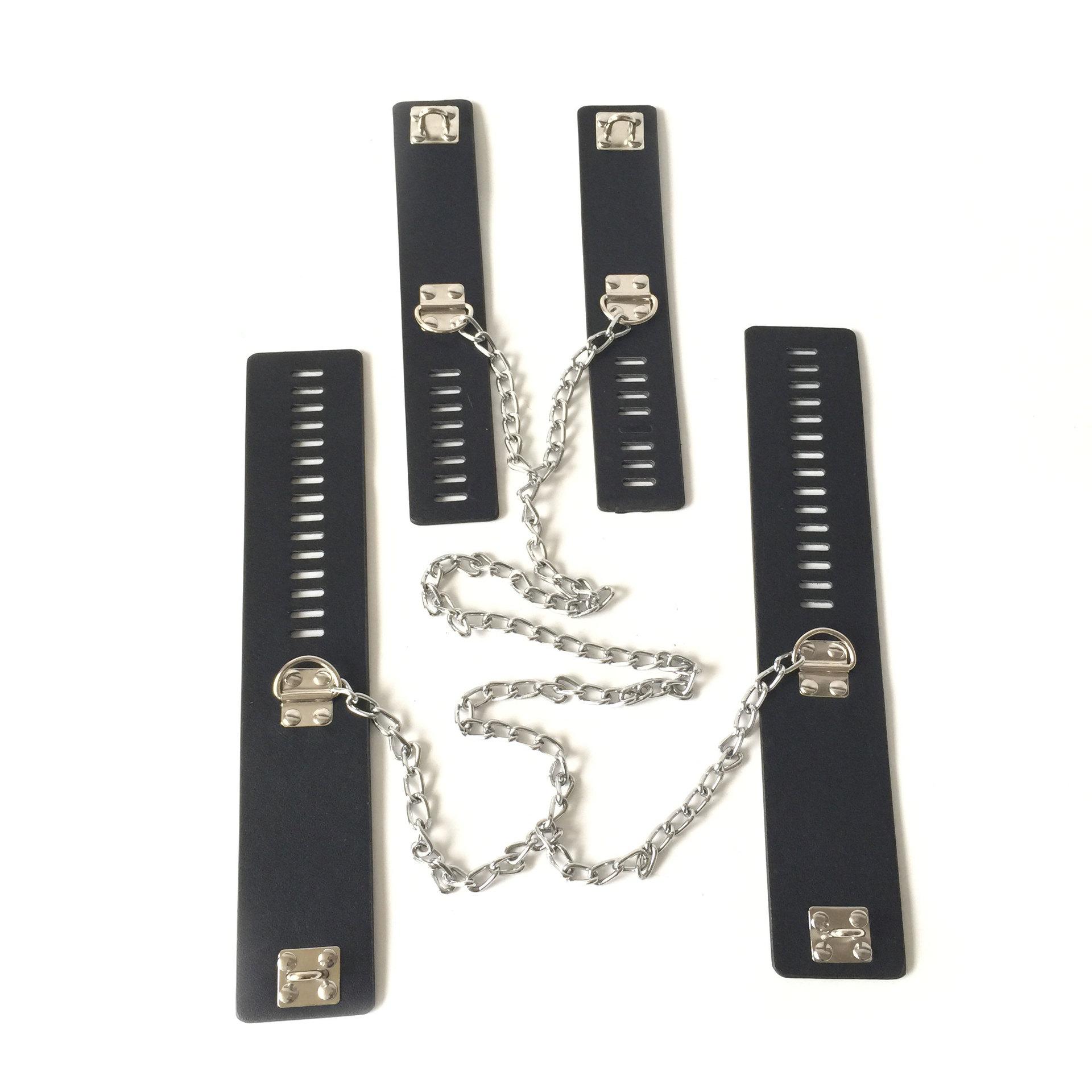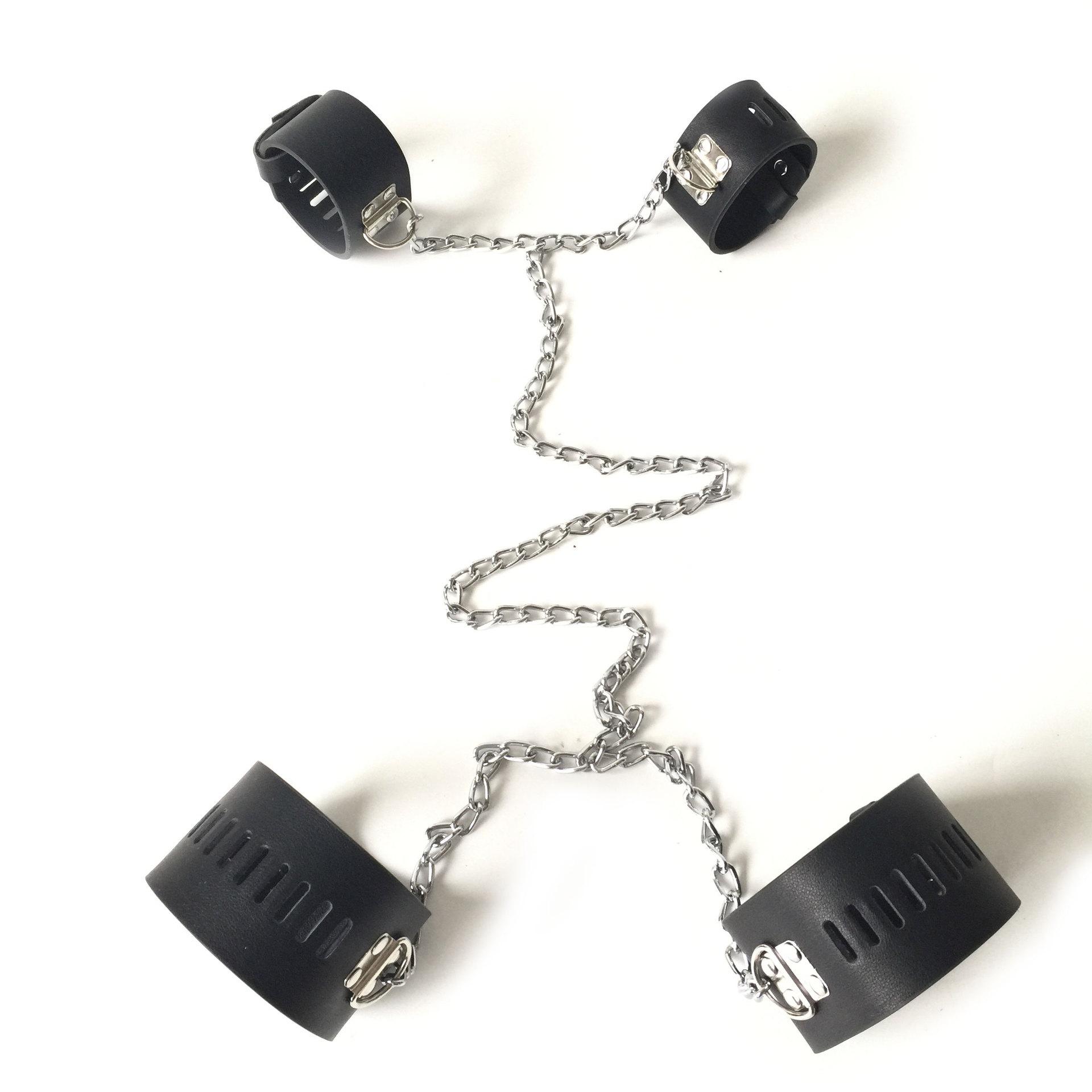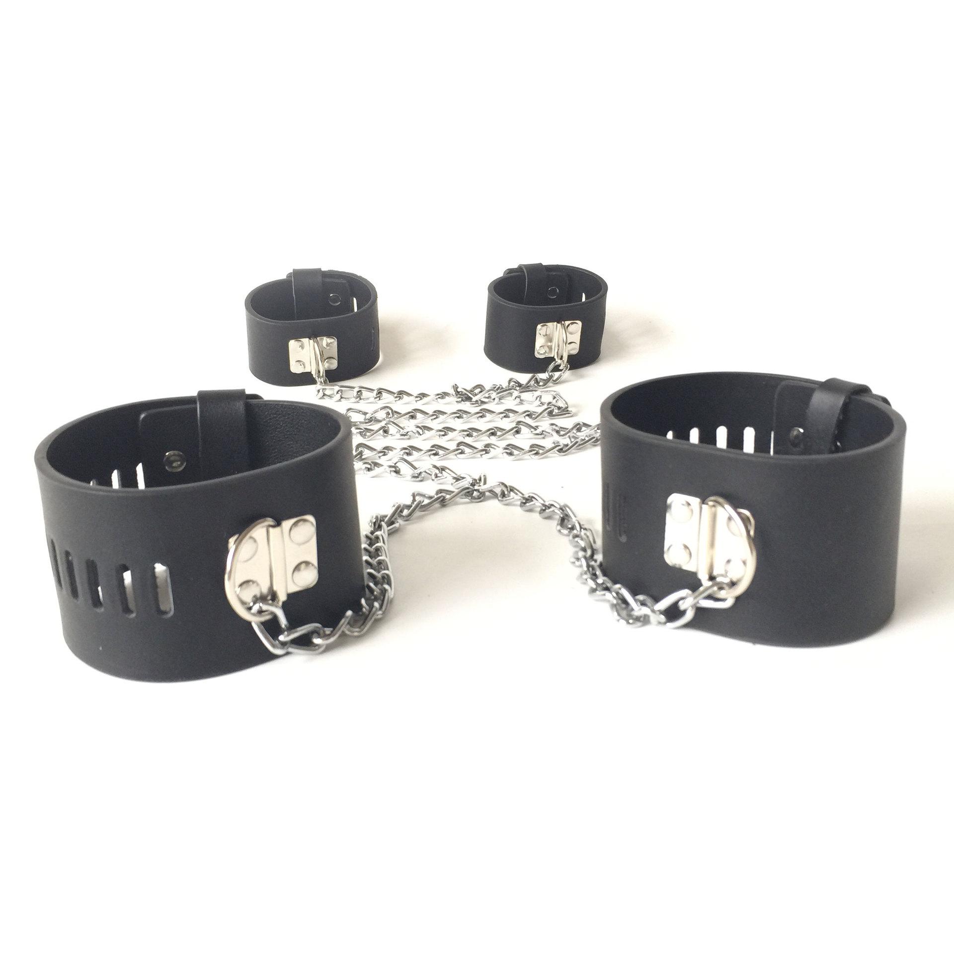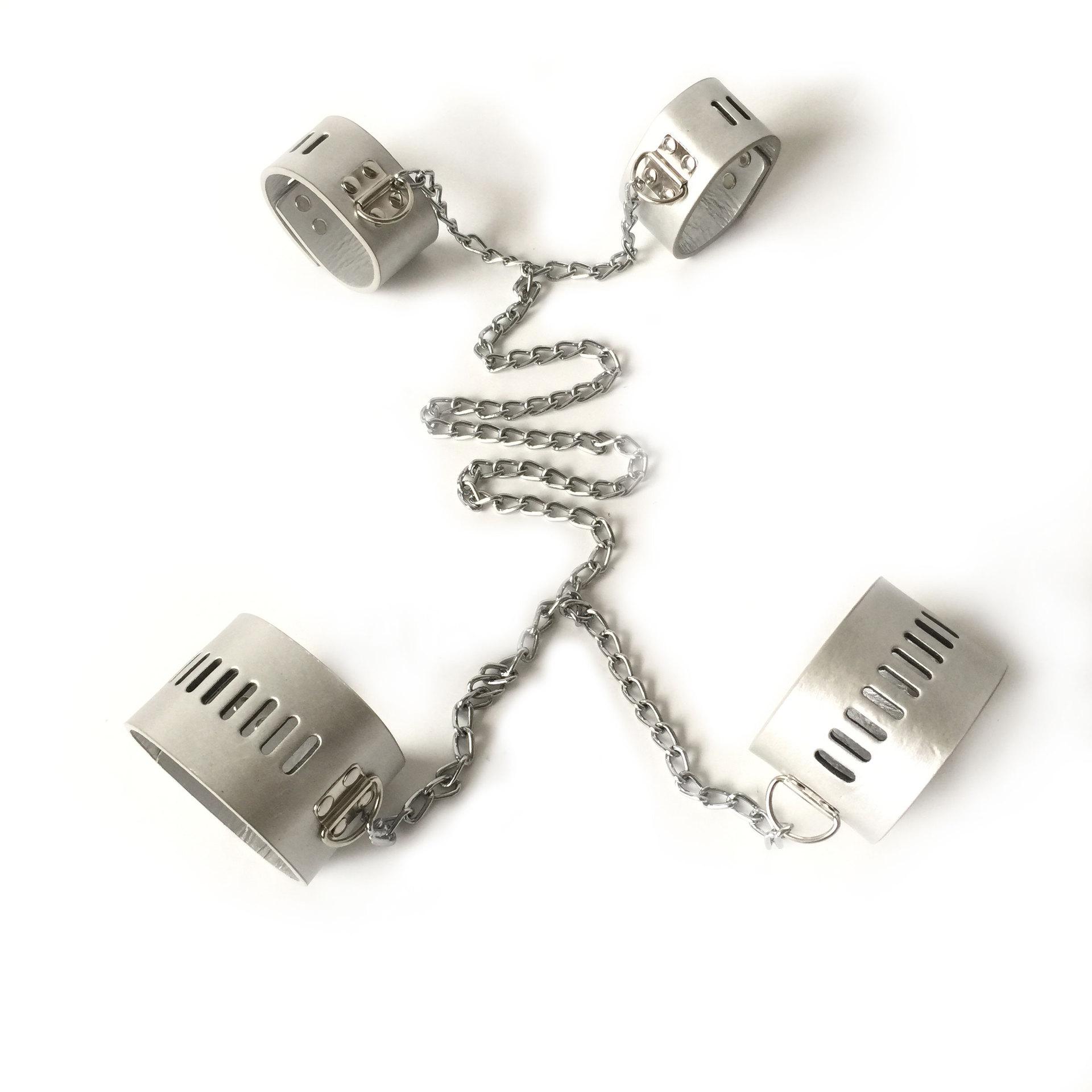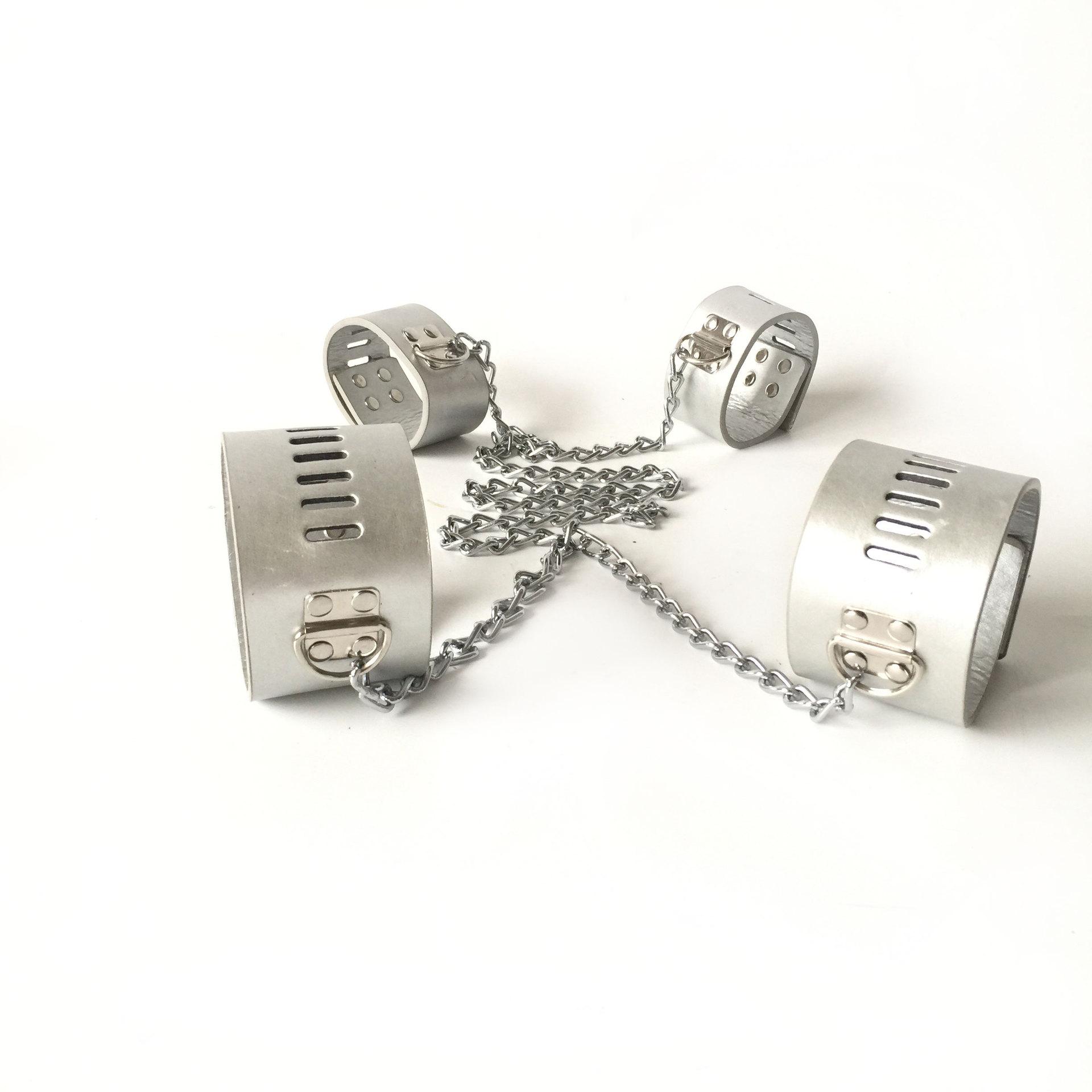 Tamanho: circunferência das algemas 15,5-24 cm, altura 4,5 cm, circunferência das algemas das pernas 16,5-31 cm, altura 5,7 cm, comprimento da corrente principal 61 cm, comprimento da corrente das algemas 22 cm, comprimento da corrente das algemas das pernas 36 cm