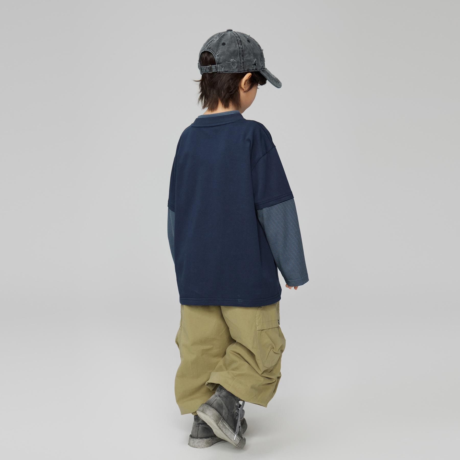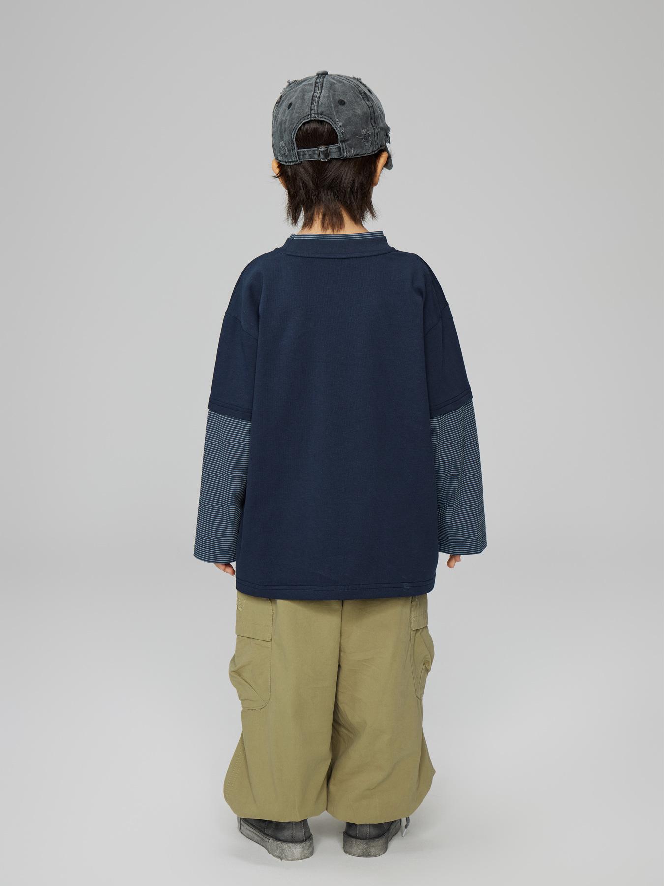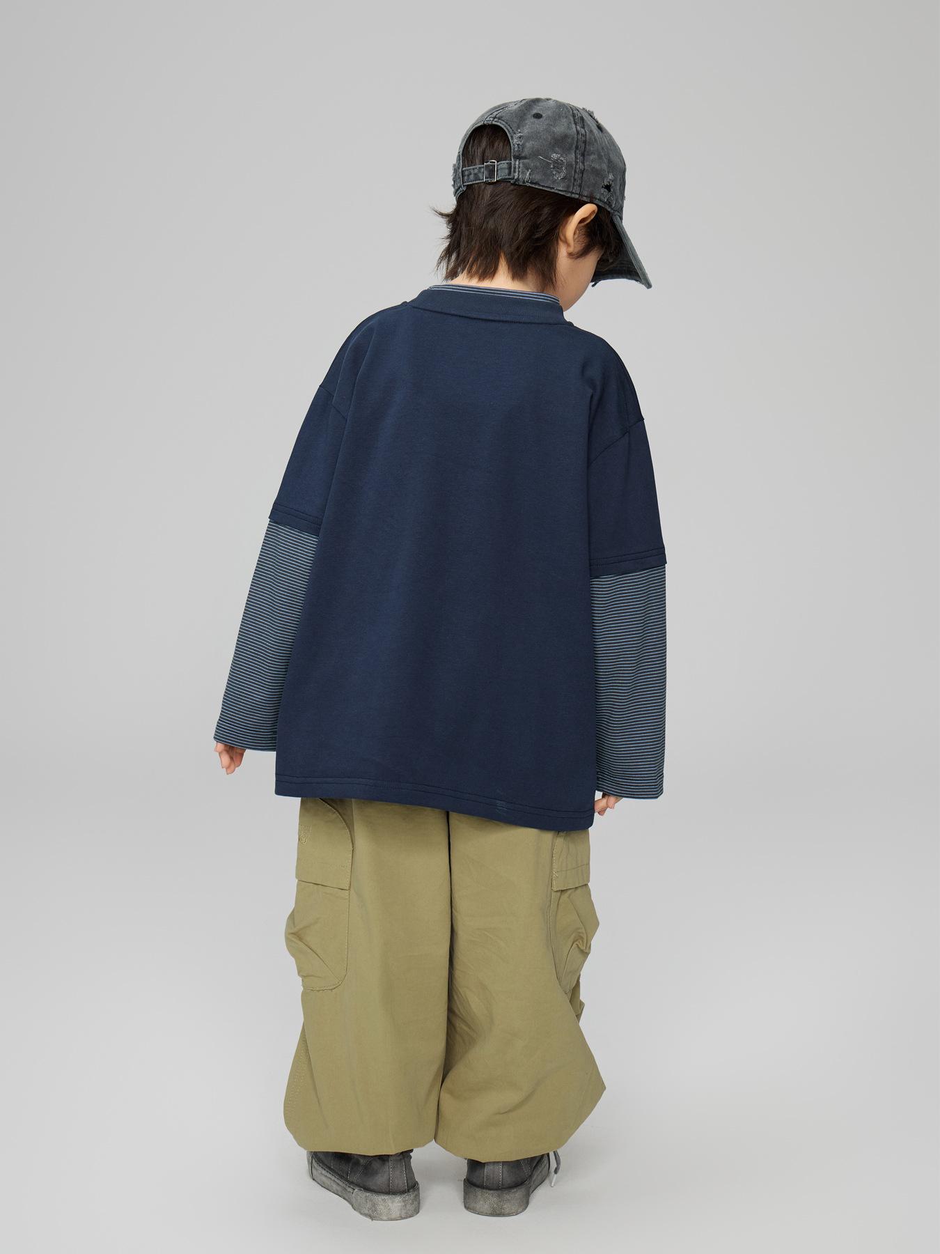 O decote é reforçado com fios elásticos para evitar deformações após a lavagem, e os detalhes são muito masculinos~