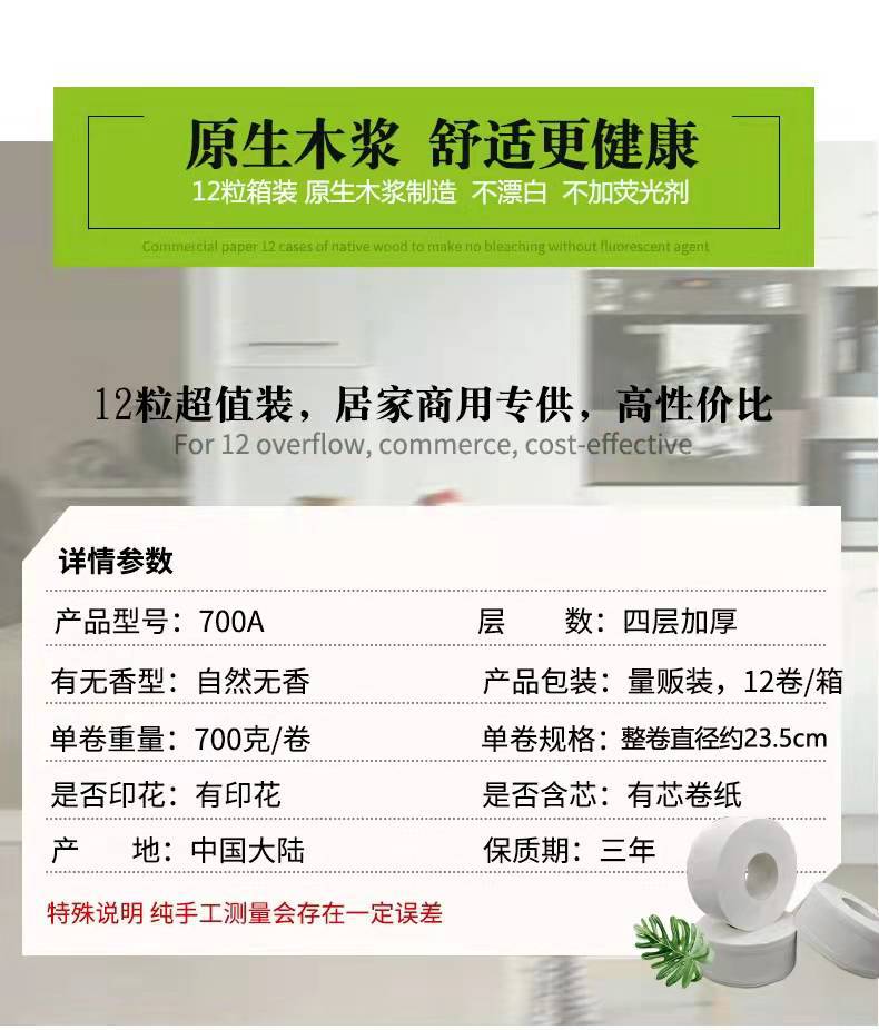 1. Rolos grandes de polpa de madeira pura espessada com quatro camadas, 12 rolos por caixa.