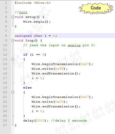 Todo2Segundos, vamosP0~P7Saída de alto nível, baixo nível.Vai3Todos os interruptores DIP estão na posição'SOBRE'Neste momento, o endereço do módulo é0x27
