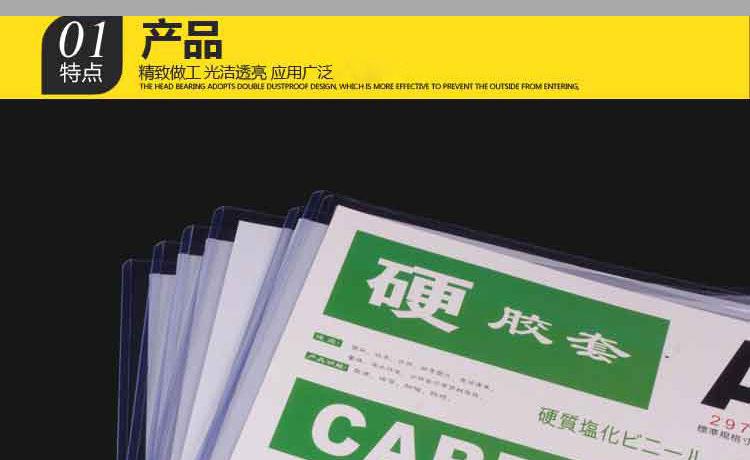 Informações do produto e introdução da função principal: Este produto é feito de matérias-primas ultratransparentes e tecnologia de produção de primeira classe, com alta clareza e boa dureza. Aplicável a: armazenamento de certificados, contratos, fotos preciosas, listas telefônicas, operações de linha de montagem, avisos públicos, etc.