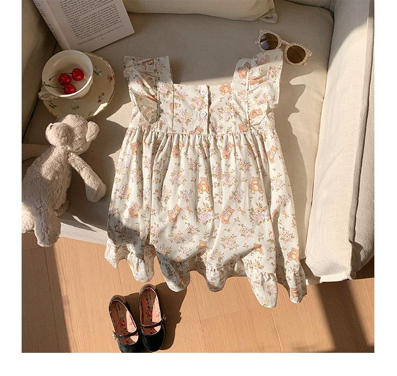 Vestido novo de verão para meninas de 2025, estilo coreano, estampa de flor de urso, manga voadora, tamanho pequeno e médio, roupa infantil, estilo ocidental, saia