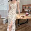 Compre Vestido floral francês com estampa simples e abotoamento simples, nova moda de verão, cintura justa, saia justa para férias, saia feminina deslizante no atacado no Joom.pro