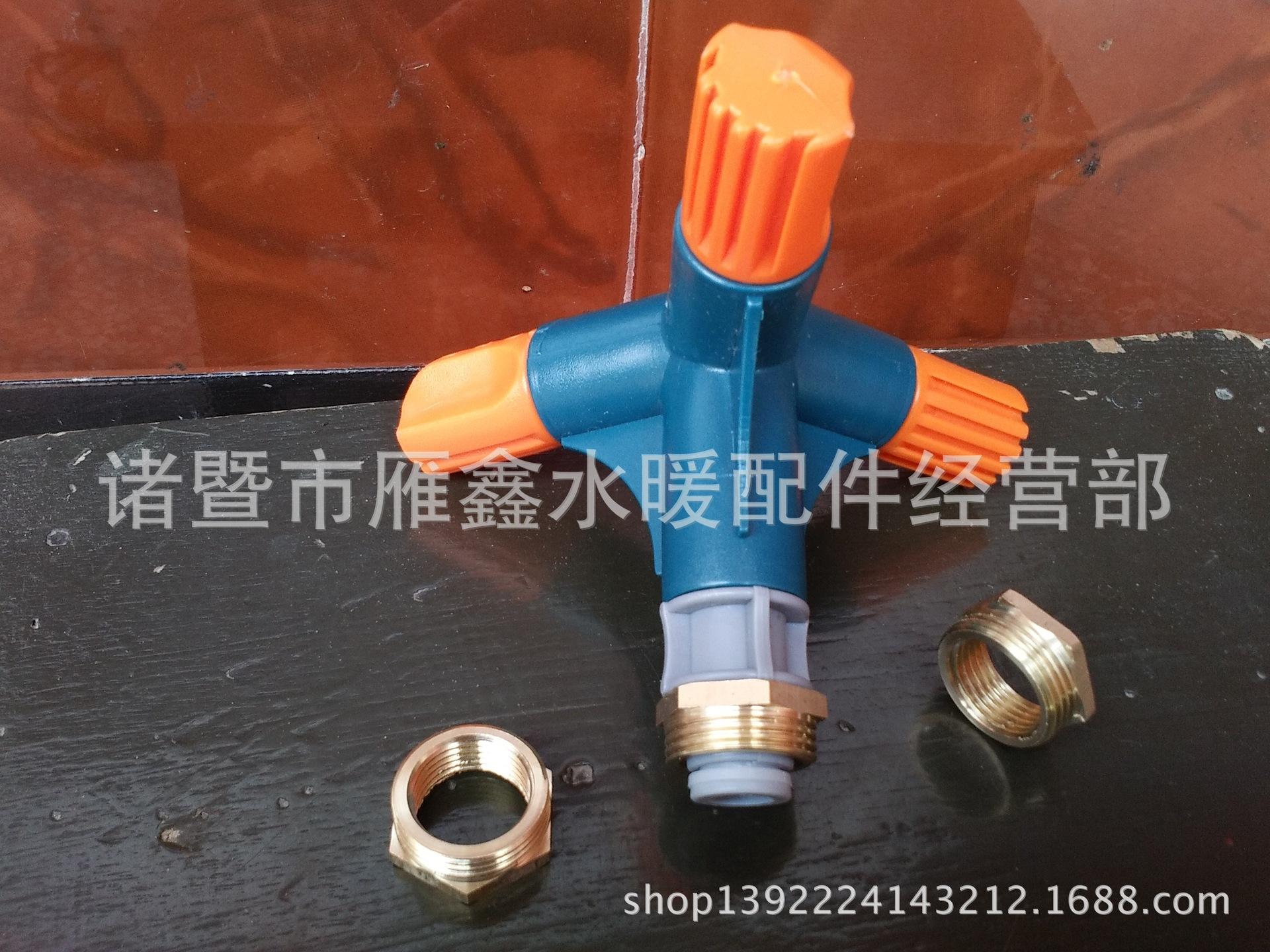 Bico giratório ajustável de plástico de 4 pontos, bico de pulverização poroso DN15, tamanho de conexão do bico de três pontas: 4 pontos 1/2, rosca externa DN15, pressão de trabalho P: 2-4 kg, fluxo de água: 0,8-2 metros cúbicos/hora, diâmetro do spray: 2-7 metros