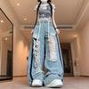 Calça jeans rasgada estilo americano retrô, perna larga, feminina, novo design de verão, calça solta e reta, moderna, com faixas