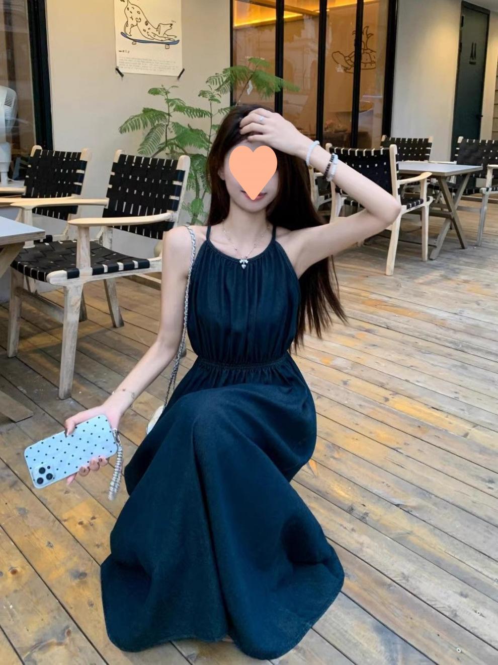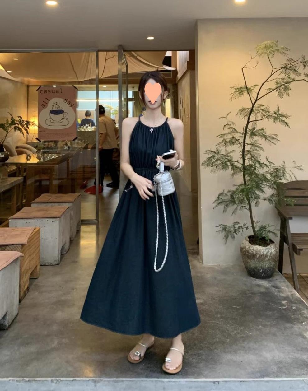 Vestido longo estilo francês azul com alças finas, sem mangas, para praia, verão, novo, férias à beira-mar