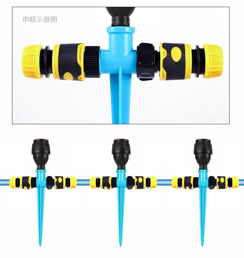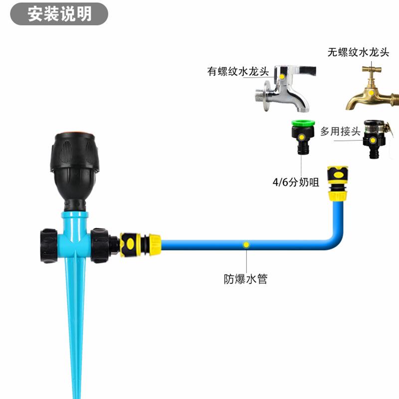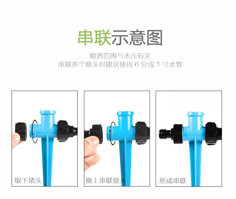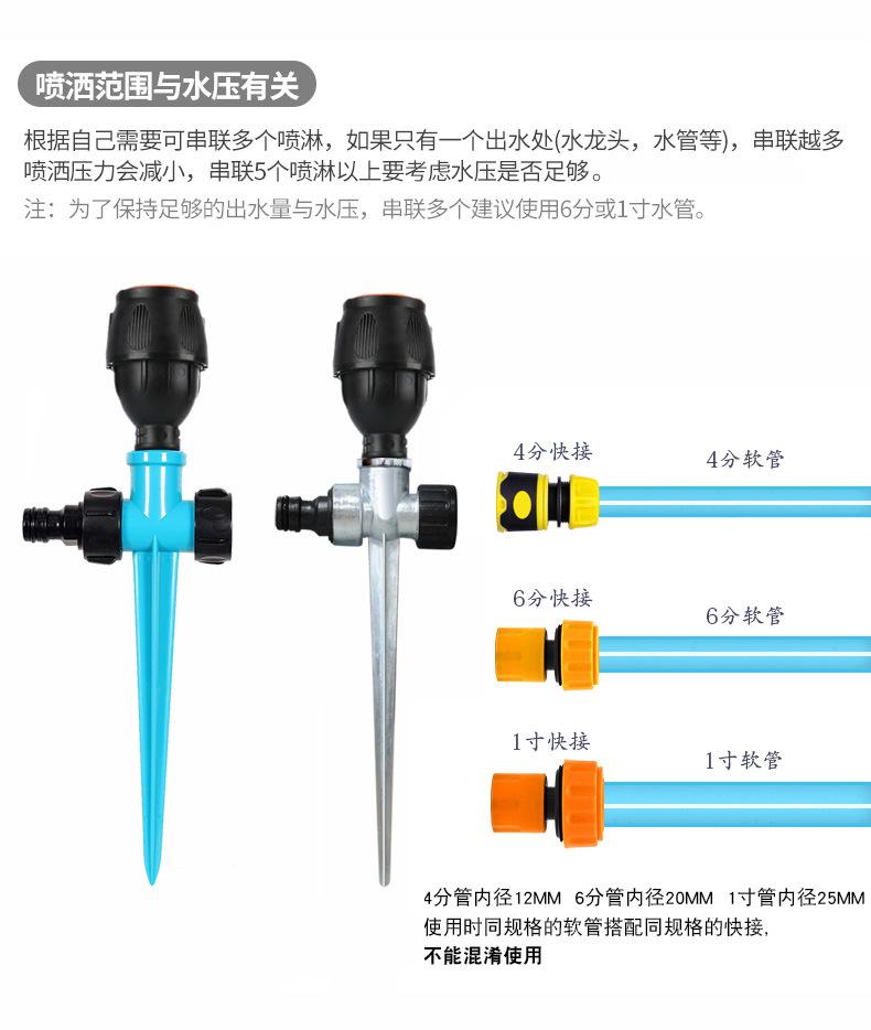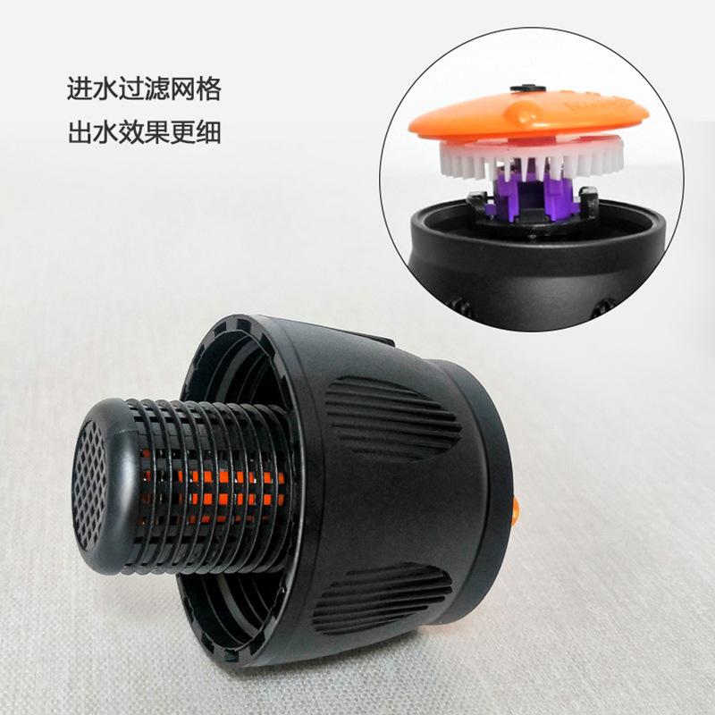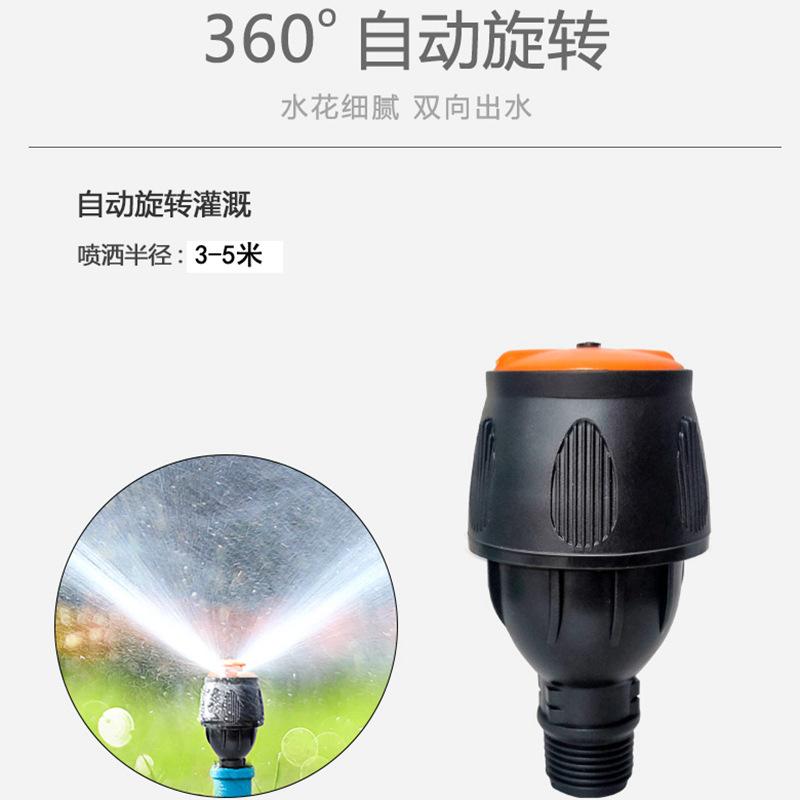 1. O corpo principal do produto é preto e a tampa superior é verde. O formato redondo é semelhante ao de uma bala de mão, e o produto em si tem o mesmo poder explosivo de uma bala de mão. A água entra no bico sob uma certa pressão e a tampa se abre sob a ação da pressão da água. A água passa por dois orifícios para formar dois jatos espetaculares que giram 360 graus e pulverizam de forma uniforme e abrangente sobre as plantações.