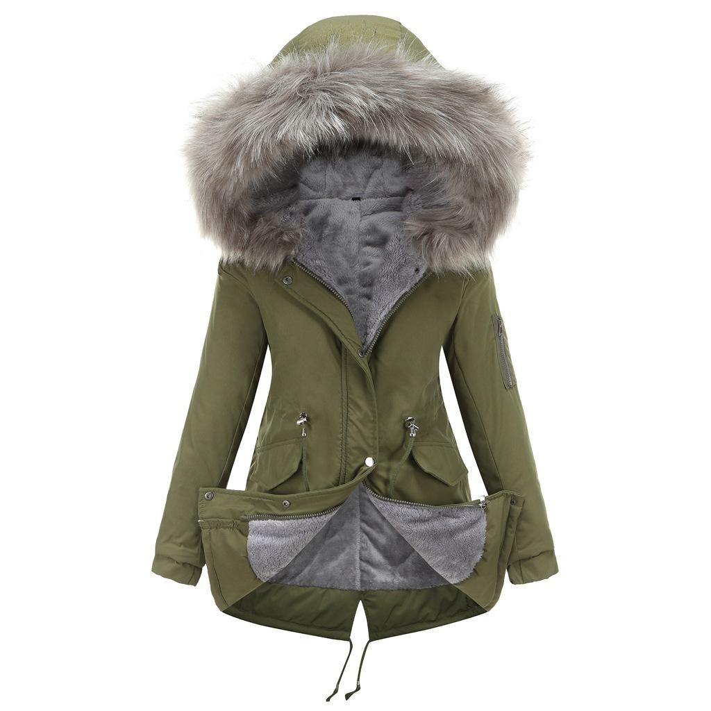 Parka de tamanho europeu transfronteiriço, casaco acolchoado de algodão, casaco acolchoado de lã quente com capuz de comprimento médio, casaco acolchoado de algodão