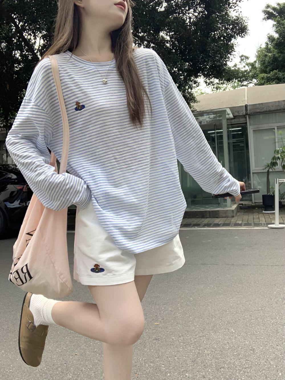 Compre Verão Novo Preguiçoso Clássico Combina com Tudo Listrado Manga Longa Camiseta Feminina Verão Fina Protetor Solar Blusa Solta Top Ins no atacado no Joom.pro