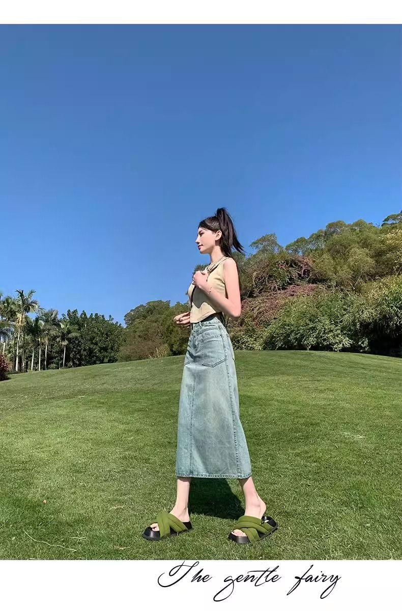 Compre Saia Jeans Midi Estilo Coreano Feminina 2025 Verão Cintura Alta Solta Emagrecedora Linha A Fenda Cor Clara Saia Quadril Ins no atacado no Joom.pro