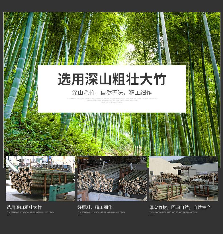 Este produto é feito inteiramente de bambu moso de montanha profunda, e apresenta cor uniforme, grão reto, superfície lisa e brilhante, e alta resistência de colagem. Disponível em cor natural e cor carbonizada.