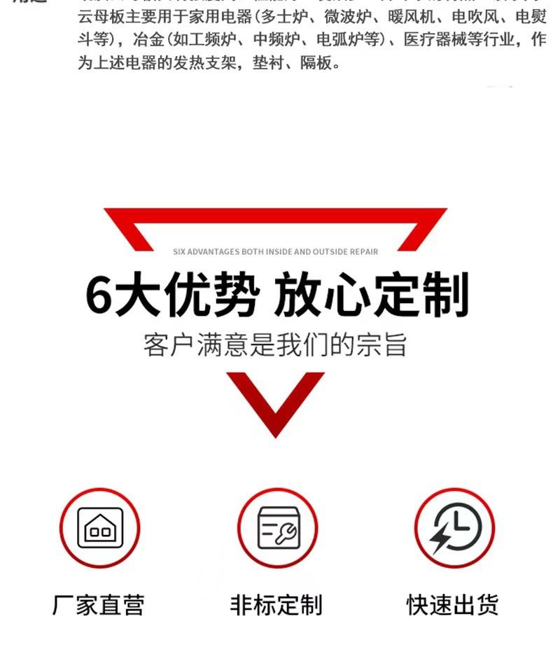 A folha de mica tem altíssima resistência e isolamento, baixa perda dielétrica e excelentes propriedades como resistência ao arco e resistência à corona. Isso faz com que tenha amplas perspectivas de aplicação em campos como eletrônica e eletrodomésticos.
