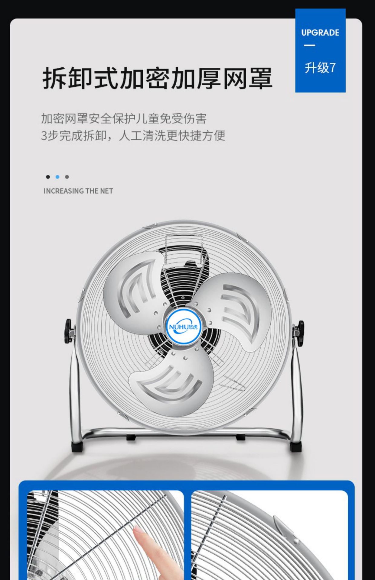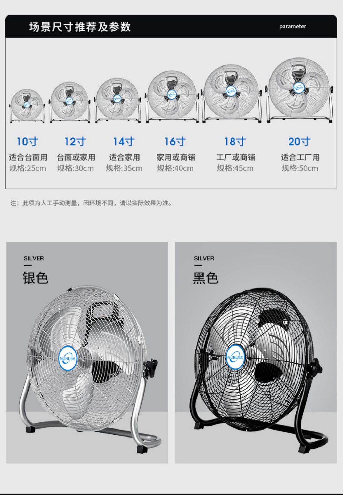 10-inch black floor fan [three-speed adjustment encryption net cover five-year warranty]], 12-inch silver floo...