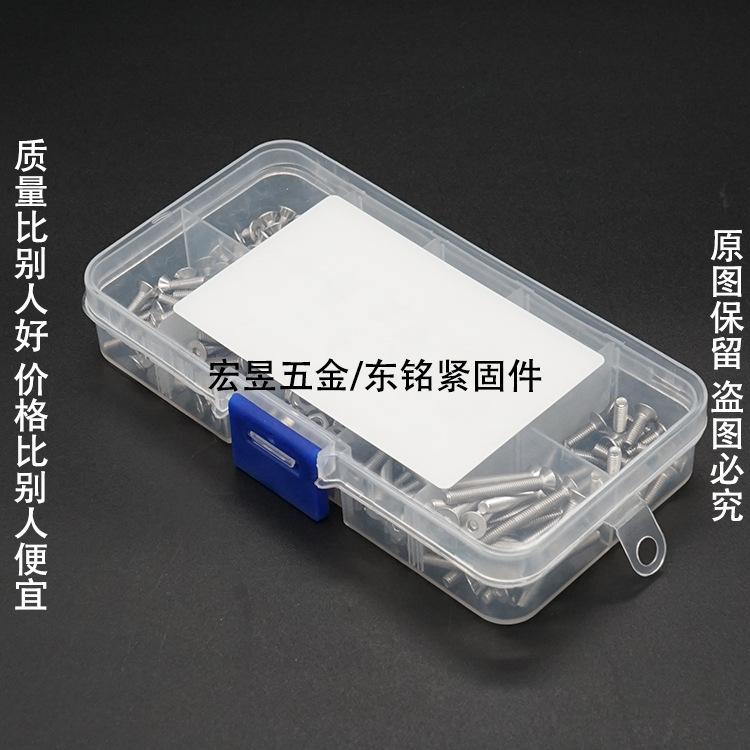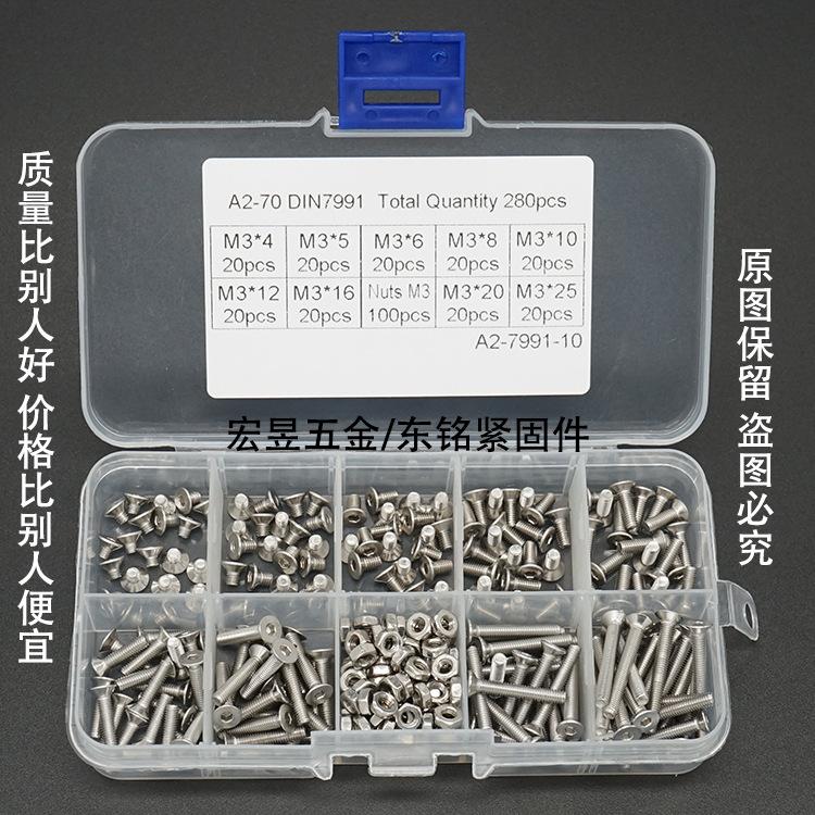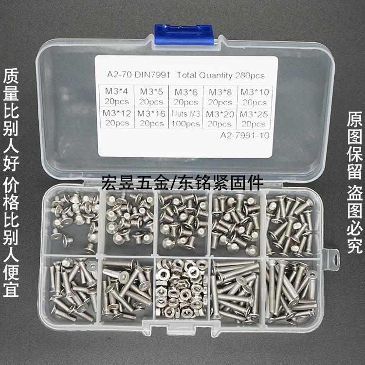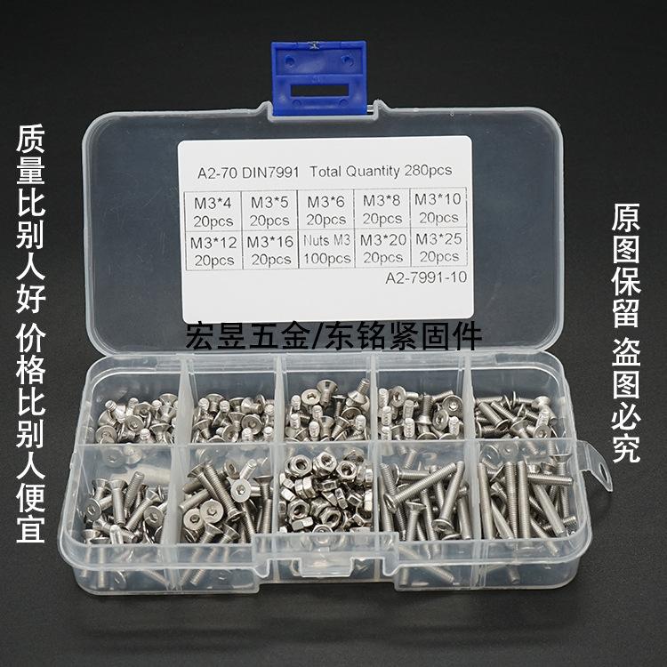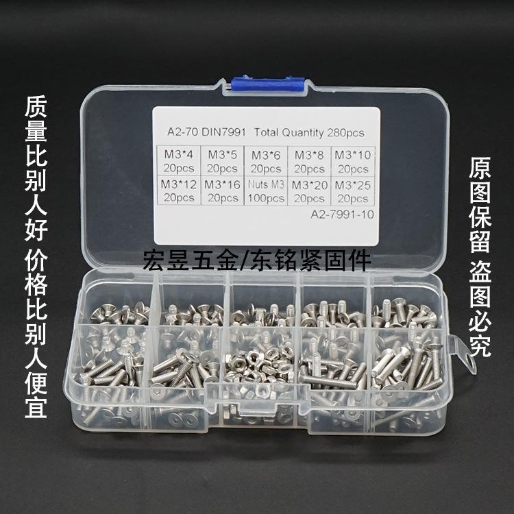 280 peças M3*4/5/6/8/10/12/16/20/25 com porca M3 aço inoxidável de comércio exterior 304 cabeça escareada parafuso hexagonal conjunto de combinação A2-7991-10 Peso líquido do produto: 170,2g