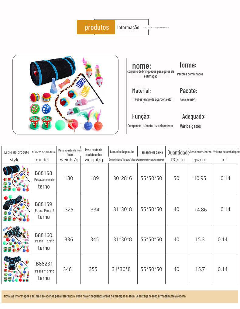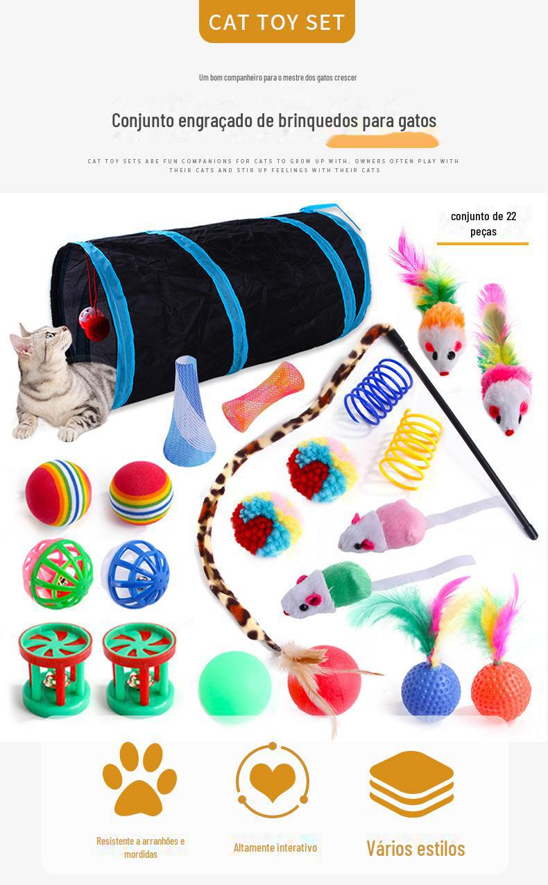 Novo brinquedo de estimação para gatos transfronteiriços, bola de sino, pena, bastão de gato engraçado, pelúcia, rato, túnel de gato de mola, 22 peças, terno