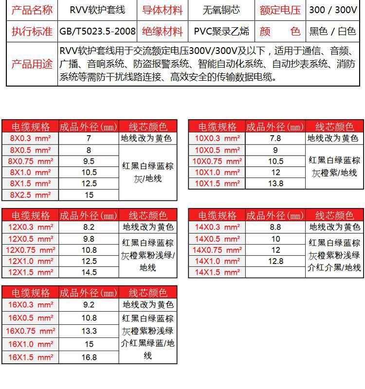 Black-RVV8 core 03 Square (10 meters), Black-RVV-8 core 05 Square (10 meters), Black-RVV-10 core 0.3 square (1...