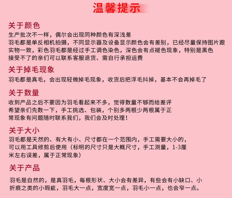 Instruções por atacado:1. Penas coloridas: 100 peças por cor, exceto penas de pérola e penas de peru