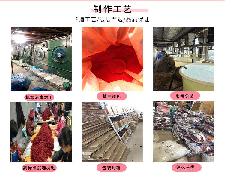 Nossa vantagem:Compramos nossas próprias matérias-primas e as processamos em nossa própria fábrica, realizamos esterilização em alta temperatura e tingimento ecologicamente correto. Nossos próprios trabalhadores os selecionam cuidadosamente para garantir qualidade e preços acessíveis. Qualquer pessoa que precise de penas pode comprar com confiança.