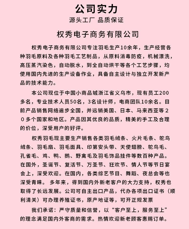 O principal negócio da nossa fábrica:Várias penas de avestruz, penas de pavão, penas de ganso, penas de galinha, penas de aves selvagens, tiras de tecido de penas, lenços de penas, artesanato de penas e outros produtos de penas