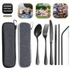 Conjunto de louça ao ar livre faca de aço inoxidável, garfo e colher pauzinhos palha de oito peças conjunto cross-border montanhismo camping portátil saco de louça