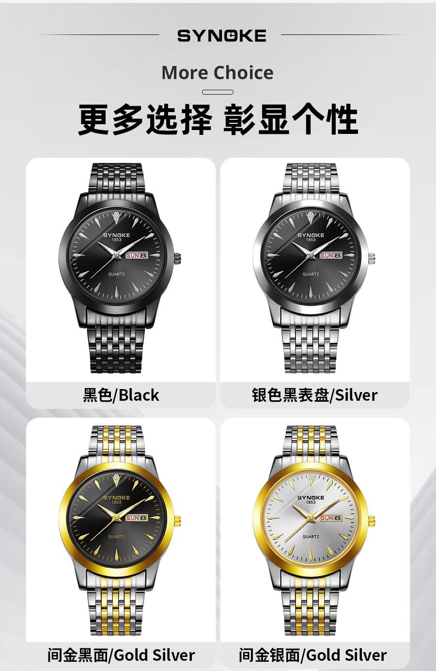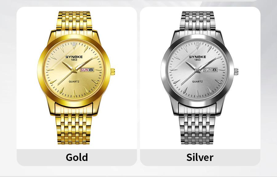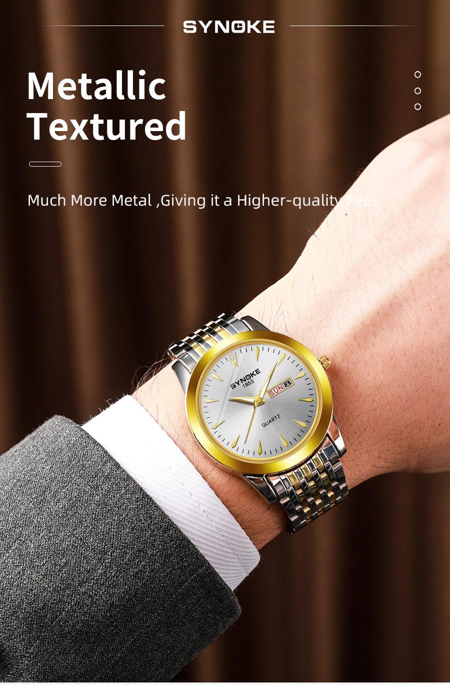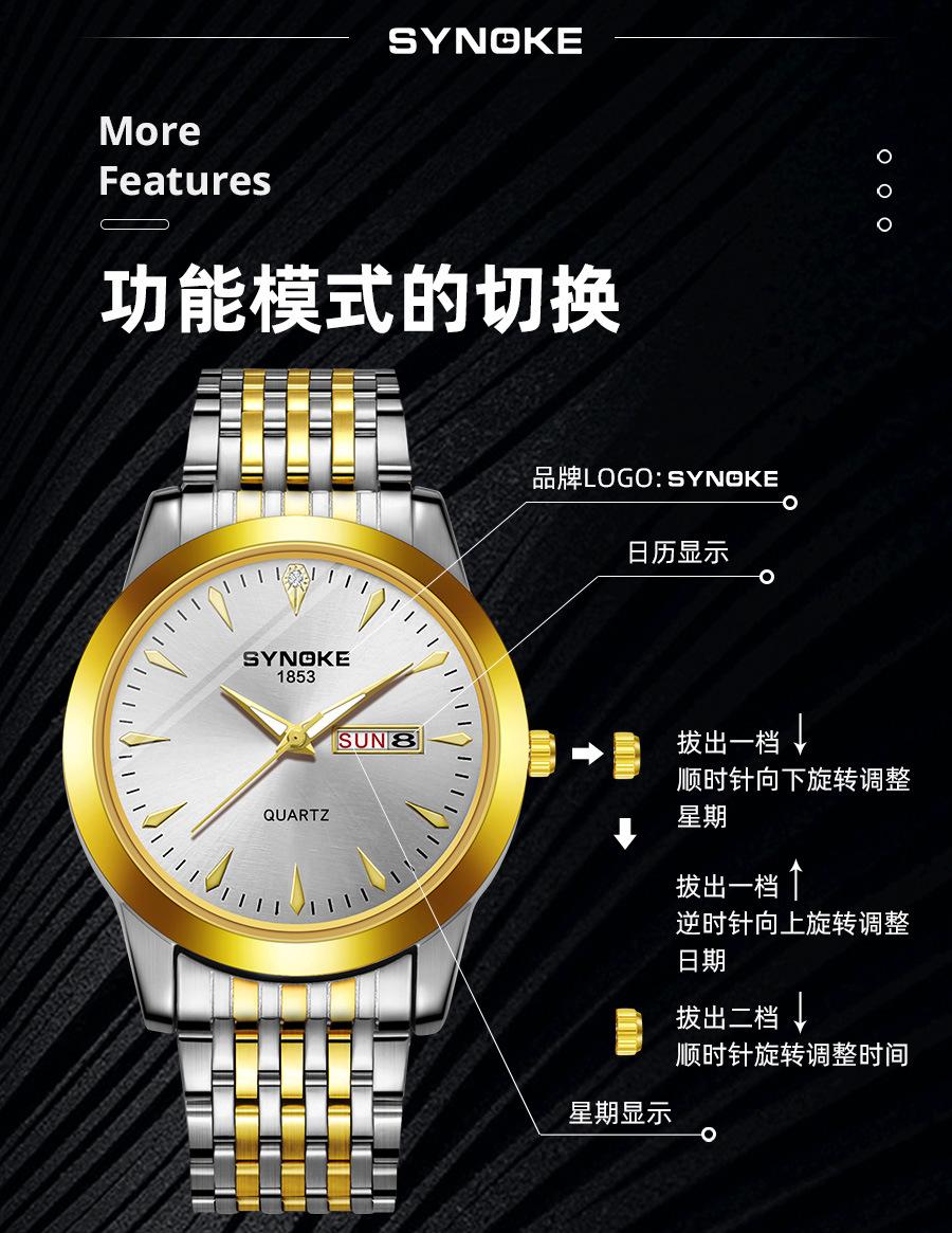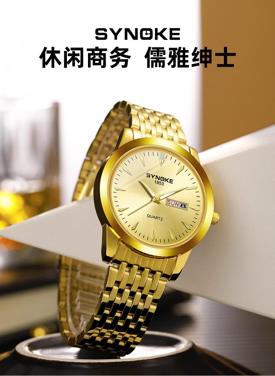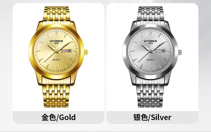 Compre Relógio de quartzo comercial SYNOKE de fábrica, relógio de liga com calendário duplo, relógio casual, moderno, clássico, pulseira de aço no atacado no Joom.pro