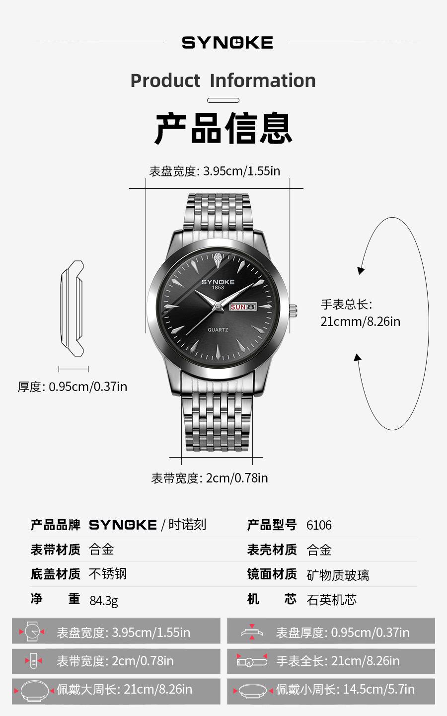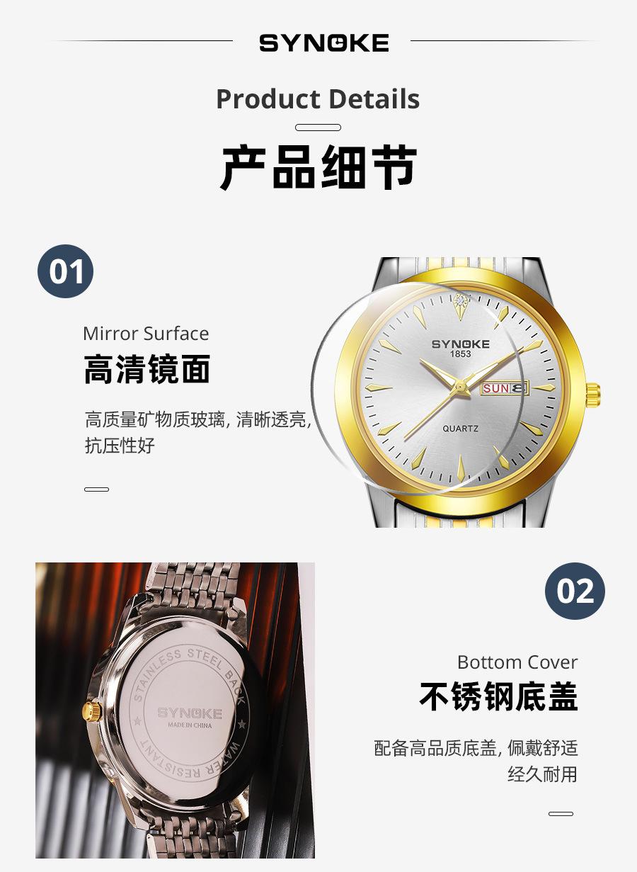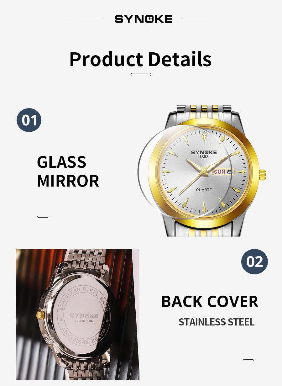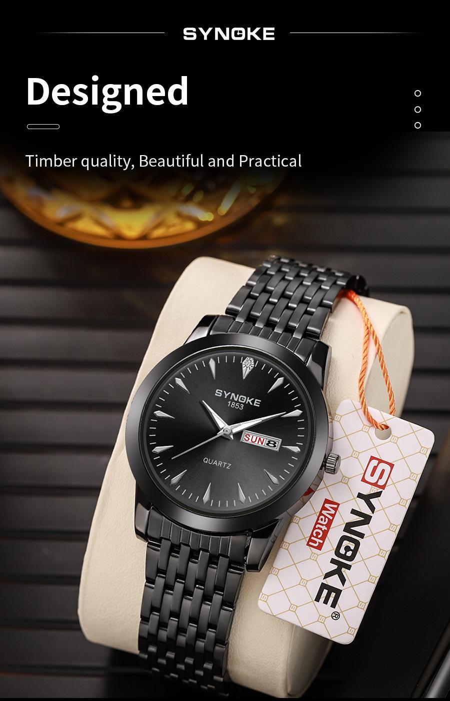 Compre Relógio de quartzo comercial SYNOKE de fábrica, relógio de liga com calendário duplo, relógio casual, moderno, clássico, pulseira de aço no atacado no Joom.pro