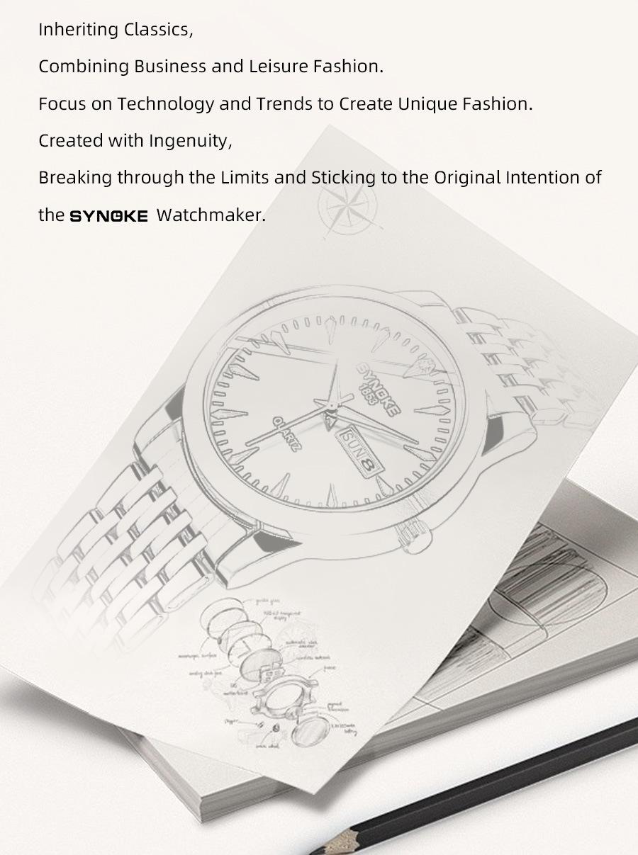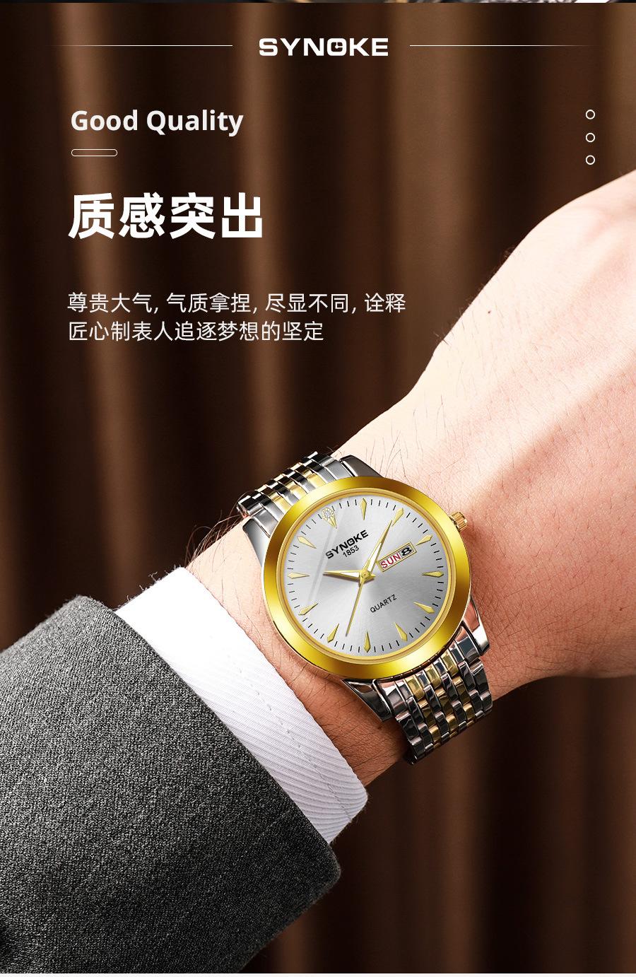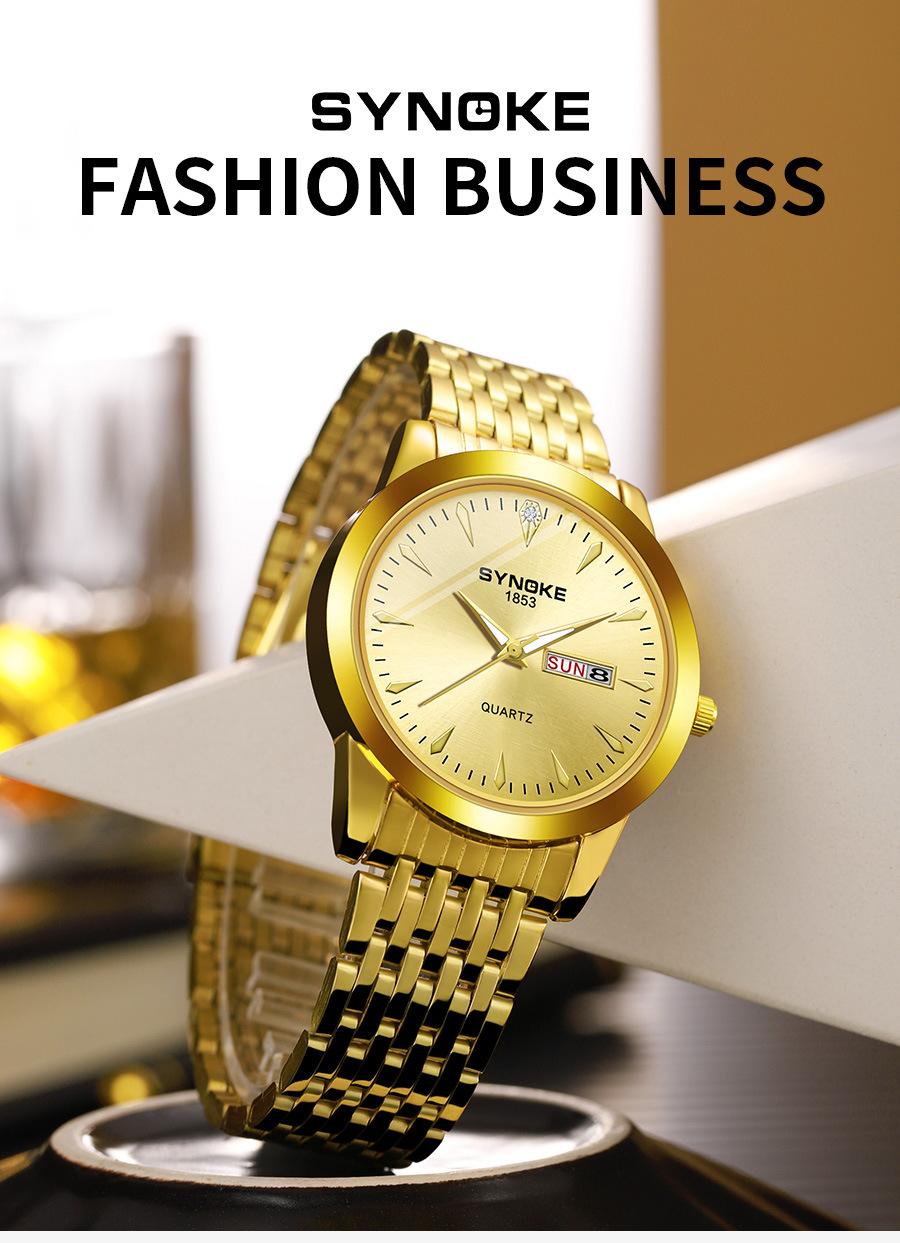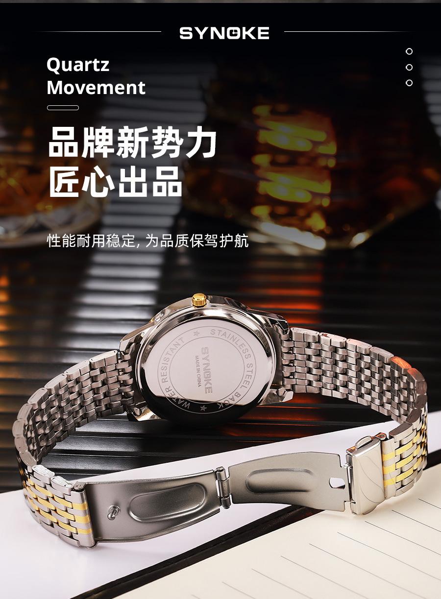 Relógio de quartzo comercial SYNOKE de fábrica, relógio de liga com calendário duplo, relógio casual, moderno, clássico, pulseira de aço