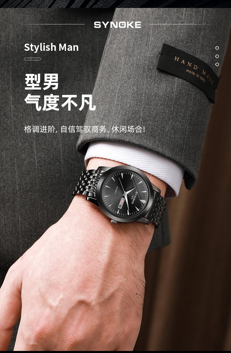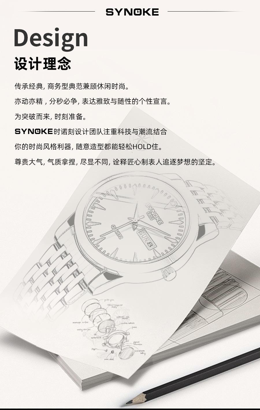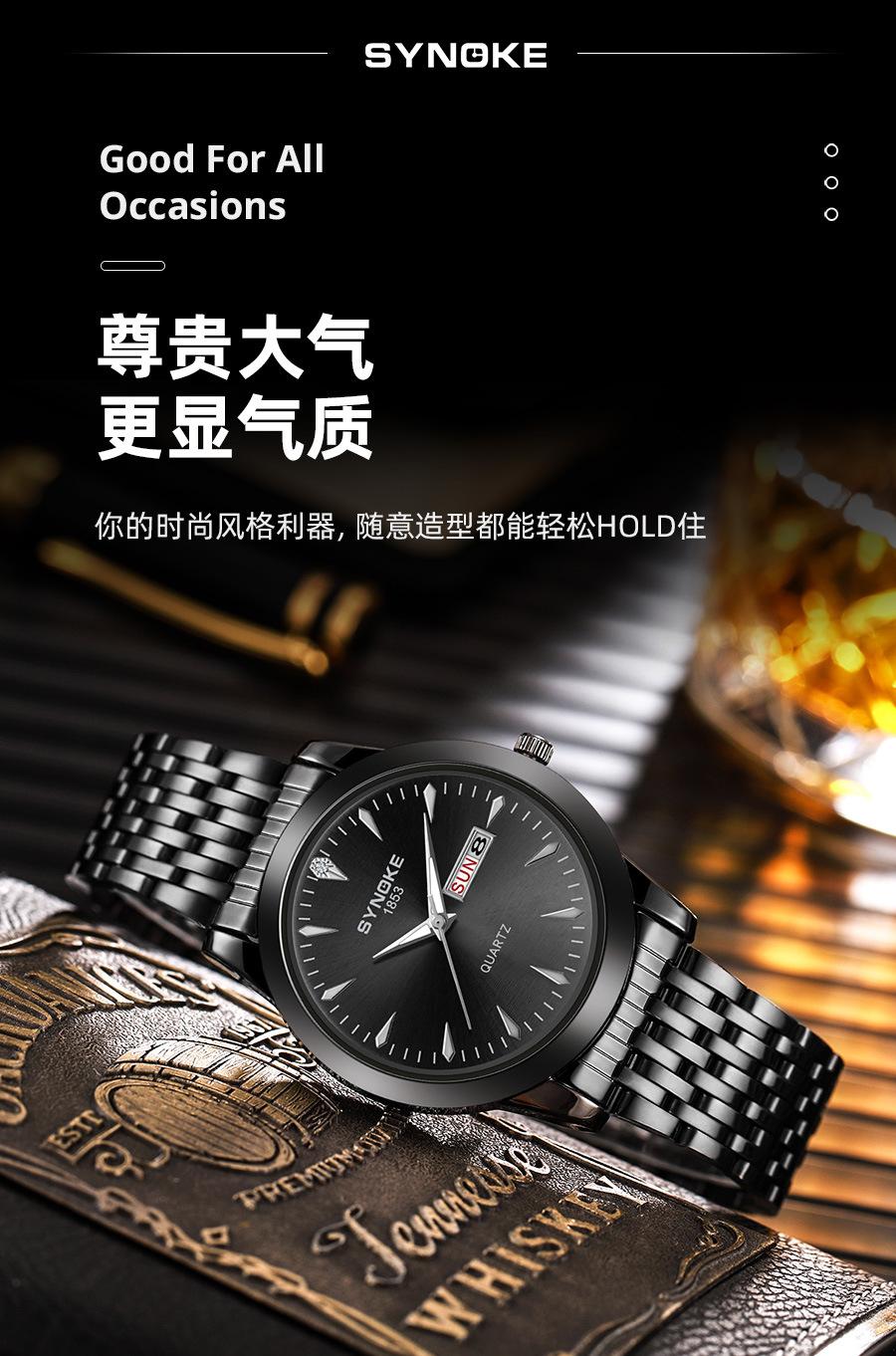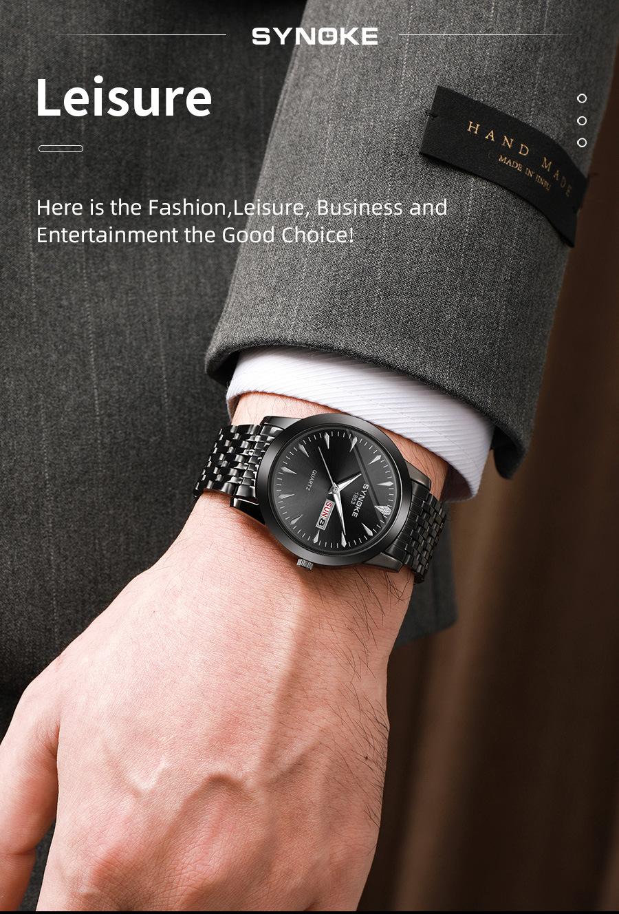 Relógio de quartzo comercial SYNOKE de fábrica, relógio de liga com calendário duplo, relógio casual, moderno, clássico, pulseira de aço