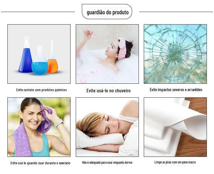 Uso e manutenção do produto: Não exponha produtos folheados a prata à água. Não os use ao dormir, tomar banho, lavar o rosto ou suar muito. Ao armazenar, seque-os com um pano seco e coloque um dessecante em uma caixa de joias. As joias folheadas a prata devem ser colocadas em uma caixa de joias quando não forem usadas.