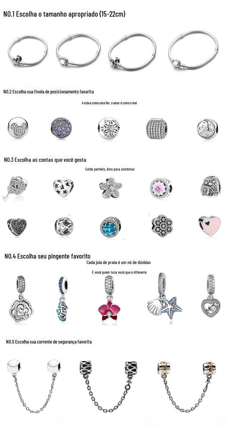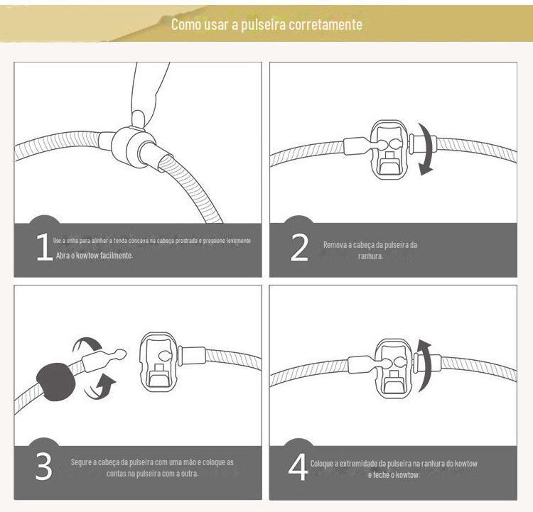 A pulseira {corrente básica} pode ser aberta e as contas podem ser trocadas e combinadas à vontade.