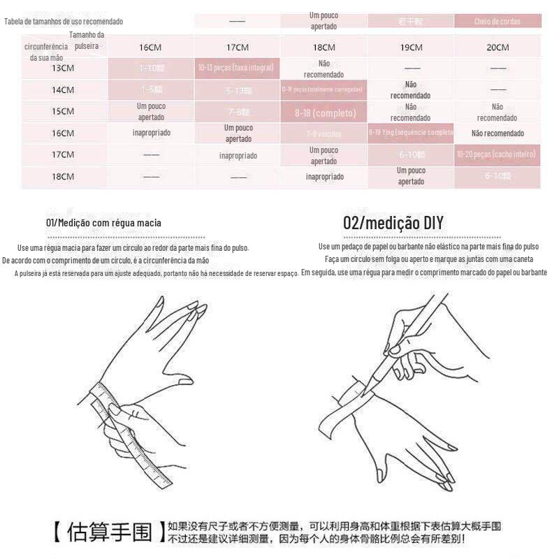 Por favor, meça o tamanho do seu pulso antes de fazer um pedido. Todos os produtos são medidos. Pode haver pequenos erros nas especificações e pesos reais do produto. O produto real prevalecerá. Geralmente, adicione 2-3 cm à circunferência líquida do pulso. Usar miçangas ocupa espaço porque o tamanho do pulso de cada pessoa é diferente, então o tamanho da foto será enviado para você. Se o tamanho não for adequado, o comprador deverá arcar com a taxa de envio de devolução. Pode haver alguma diferença de cor entre o produto real e a imagem. Se você se importa, tome isso com cautela.