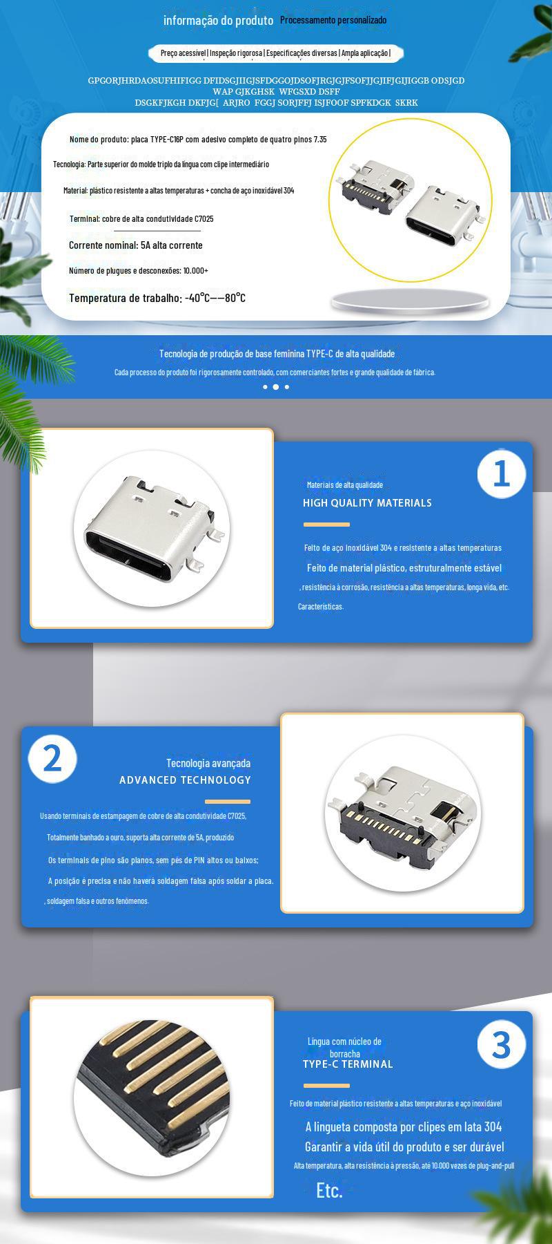 Base TIPO-C 16P/16 pinos tipo de placa 7,35 horizontal totalmente montada quatro pinos totalmente montada porta de carregamento de alta corrente 5A