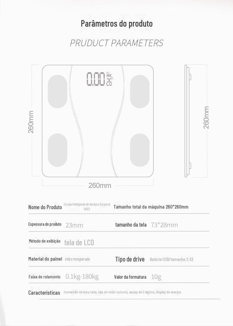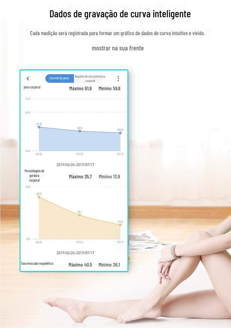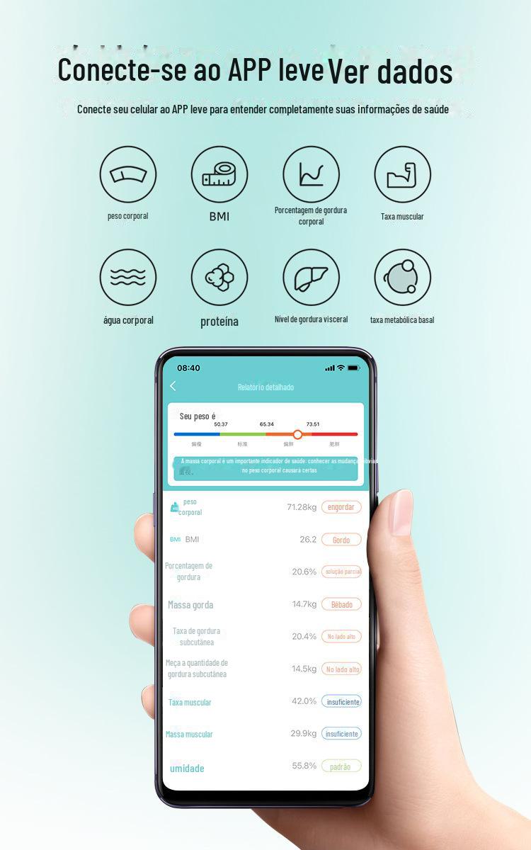 1. Os dados de gordura corporal são obtidos por meio da pesagem pelo sensor da balança + análise de algoritmo inteligente de big data do APP, não medição direta pela balança de gordura corporal. O padrão na balança é apenas para decoração.