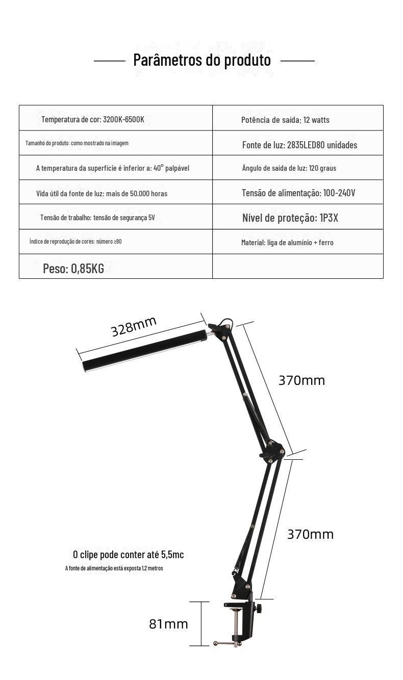 Lista de embalagem: 1 luminária de mesa com clipe + cabo USB