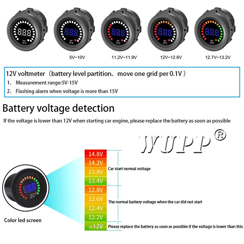 [Faixa de teste do voltímetro]: 5-15 V (11,3 V-11,9 V acende em vermelho; 12,0 V-12,5 V acende em amarelo; 12,6 V-15 V acende em verde)