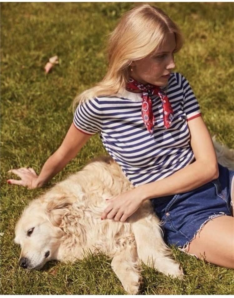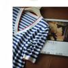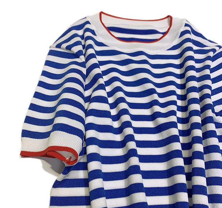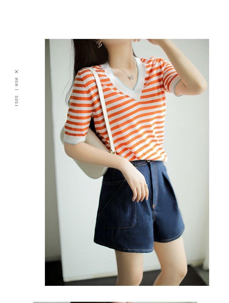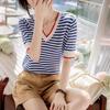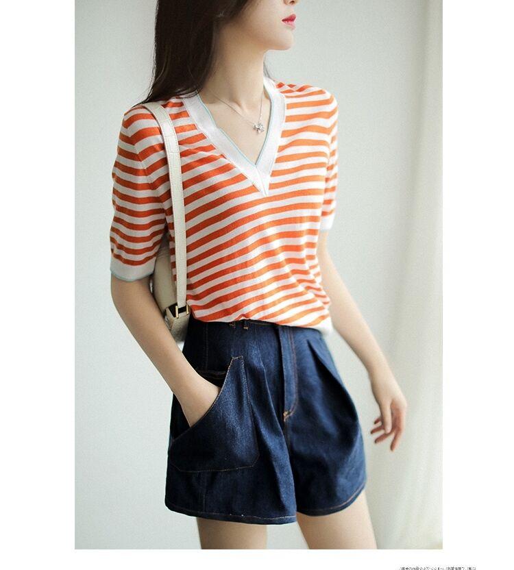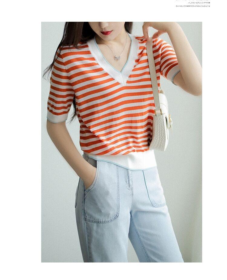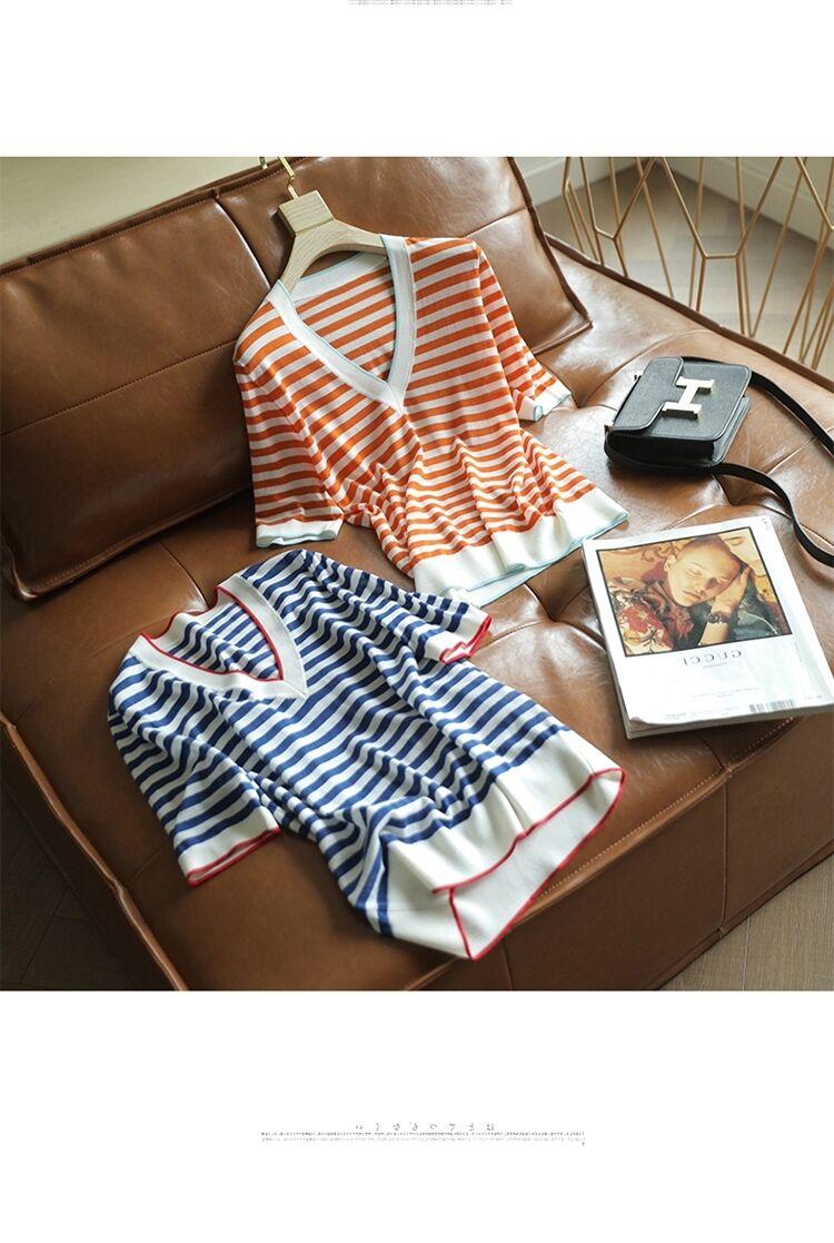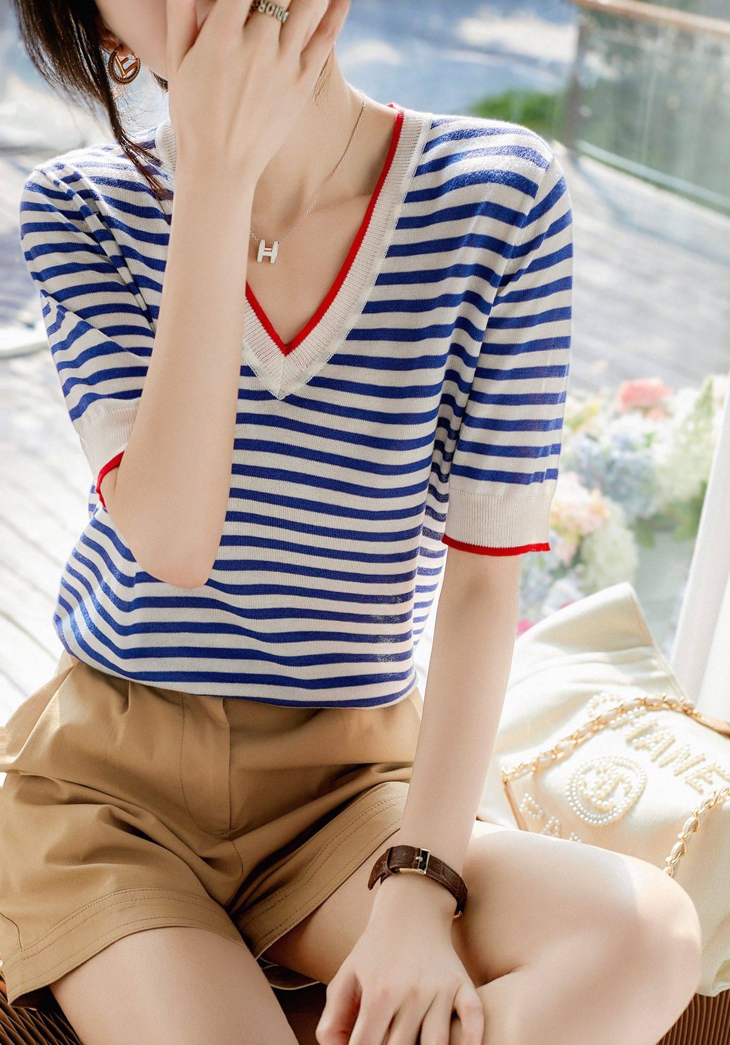 Compre Nova Malha de Seda Gelo Branca com Listras Azuis e Brancas de Verão 2024 da Gejia Top Slim de Manga Curta com Decote V Marinho Feminino no atacado no Joom.pro