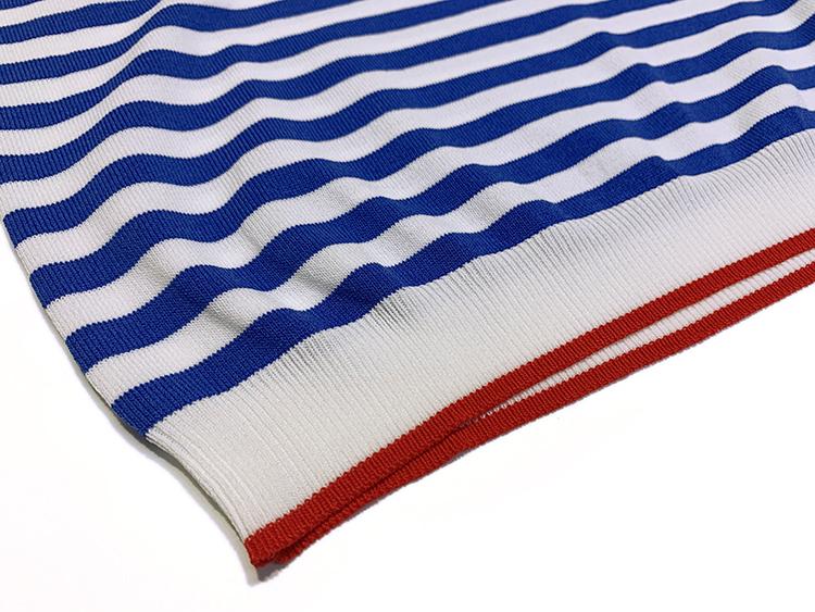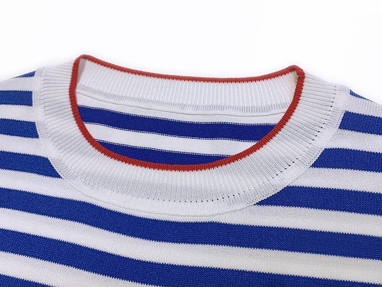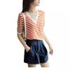 Nova Malha de Seda Gelo Branca com Listras Azuis e Brancas de Verão 2024 da Gejia Top Slim de Manga Curta com Decote V Marinho Feminino