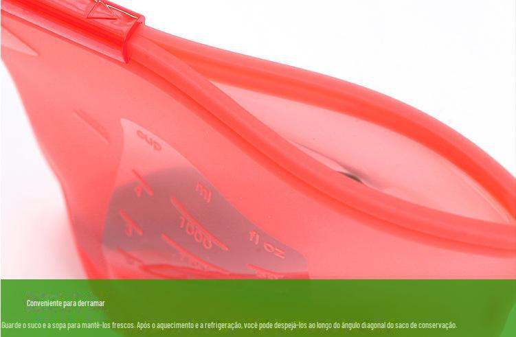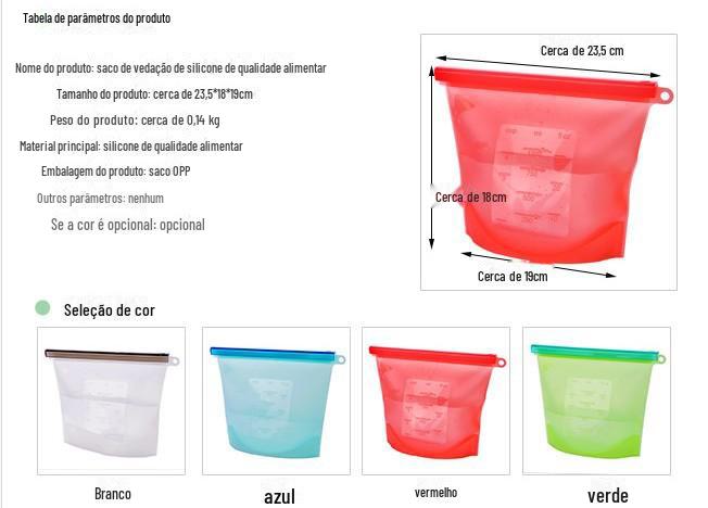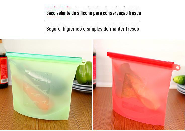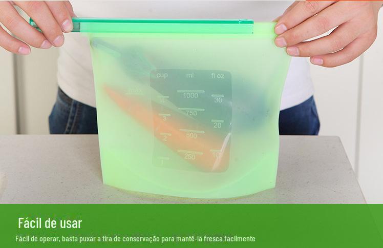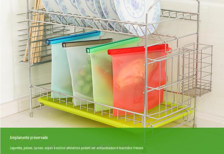 Sacos plásticos de silicone podem ser usados para armazenar vários alimentos. Uso: Saco de reciclagem de geladeira.