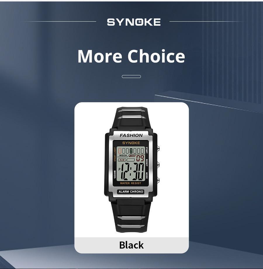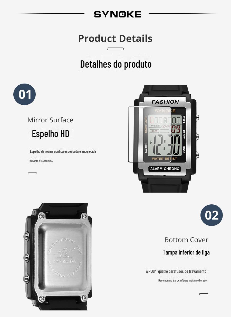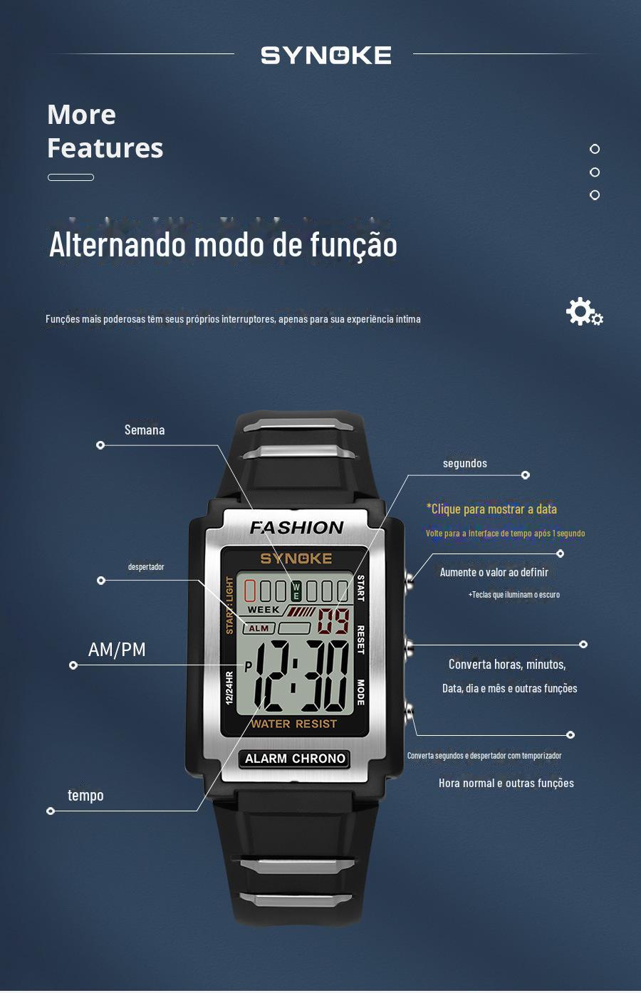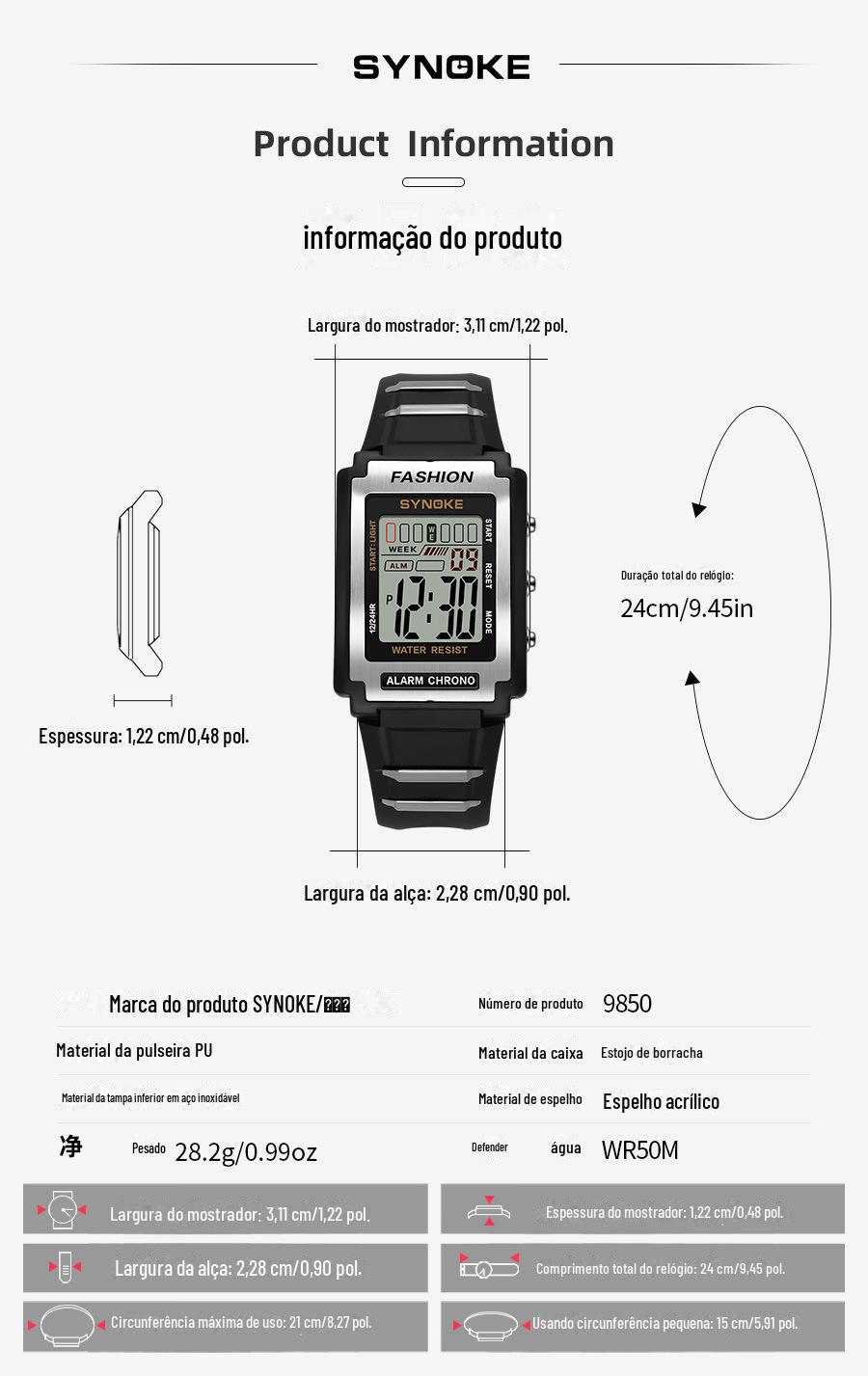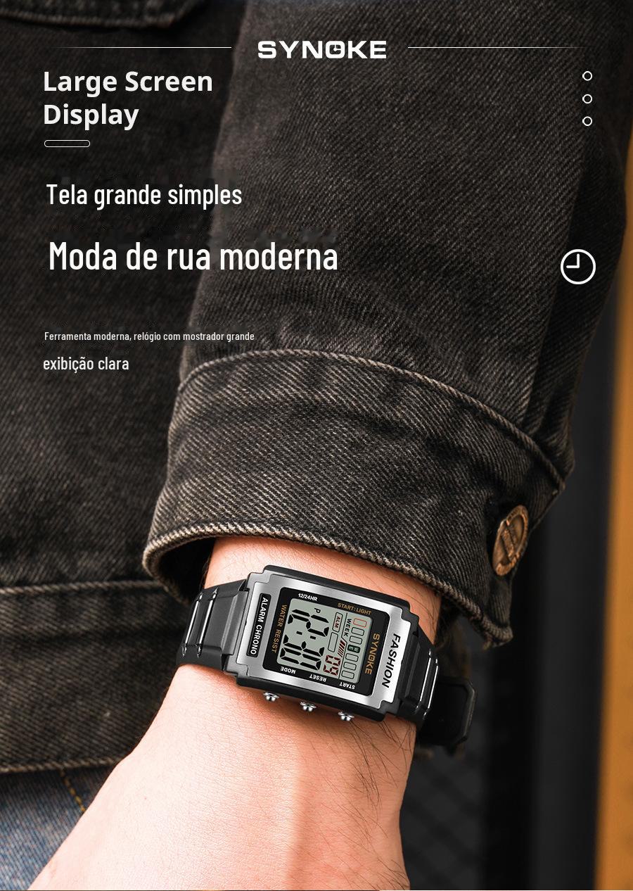 Relógio Digital Esportivo Retangular Synoke Niche À Prova D'água Luminoso Tela Grande Alarme Moderno Retrô