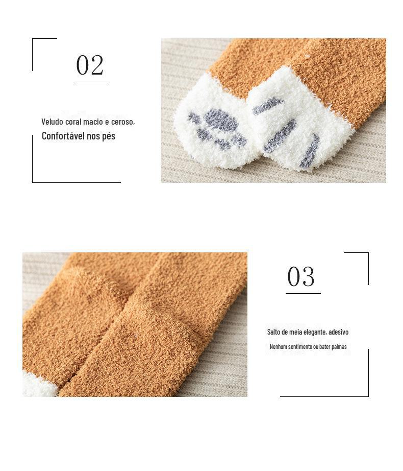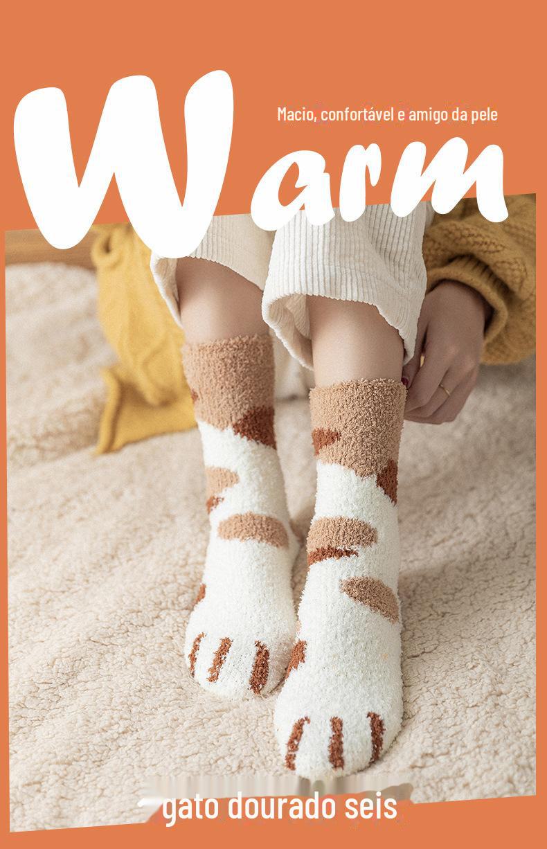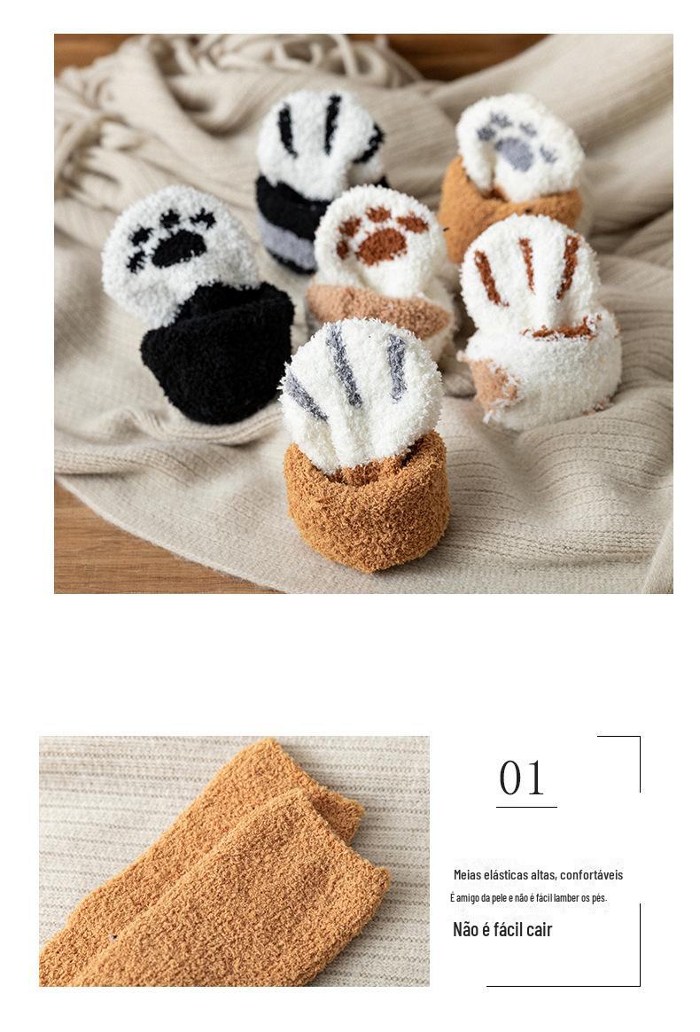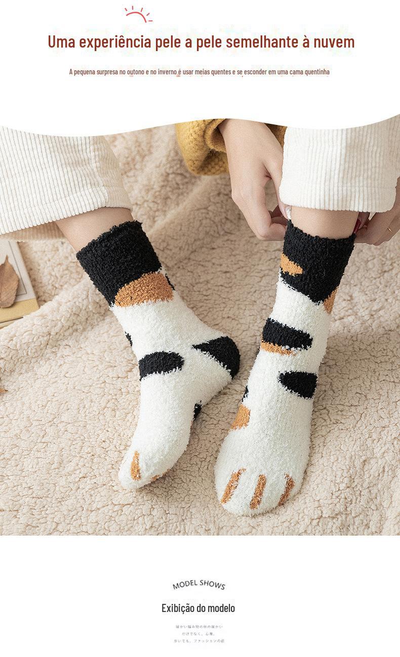 Meias femininas, meias de veludo coral no meio da panturrilha, lã quente com garras de gato, outono e inverno espessadas, além de meias de veludo para dormir, meias de confinamento de tubo longo
