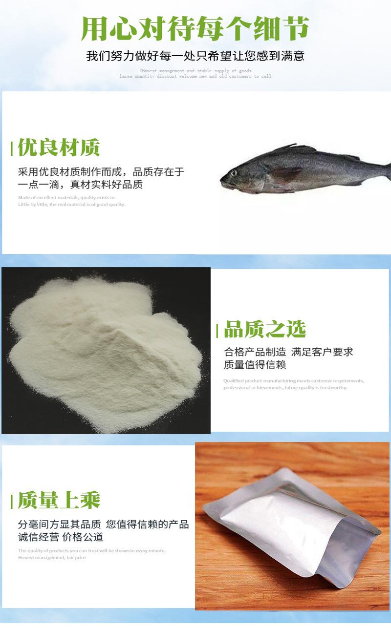 [Nome do produto] Oligopeptídeo de bacalhau, peptídeo de molécula pequena de bacalhau, peptídeo de colágeno de pele de bacalhau 【Características do produto】Molécula pequena (500Da), facilmente solúvel em água, fácil de absorver; sem desnaturação de proteínas, sem precipitação em acidez, sem coagulação quando aquecido, boa fluidez e outras boas propriedades de processamento, é um excelente ingrediente alimentar. [Cheiro] Especial [Personagem] Pó fino esbranquiçado, sem aglomeração, sem impurezas [Fonte de extração] A proteína de bacalhau de grande peso molecular é decomposta em pequenos fragmentos moleculares compostos de 2 a 10 aminoácidos usando enzimas biotecnológicas. [Processo de produção] Hidrólise enzimática [Especificação] 98% (este produto) [Peso molecular] Mais de 98% do hidrolisado tem um peso molecular inferior a 500 Da