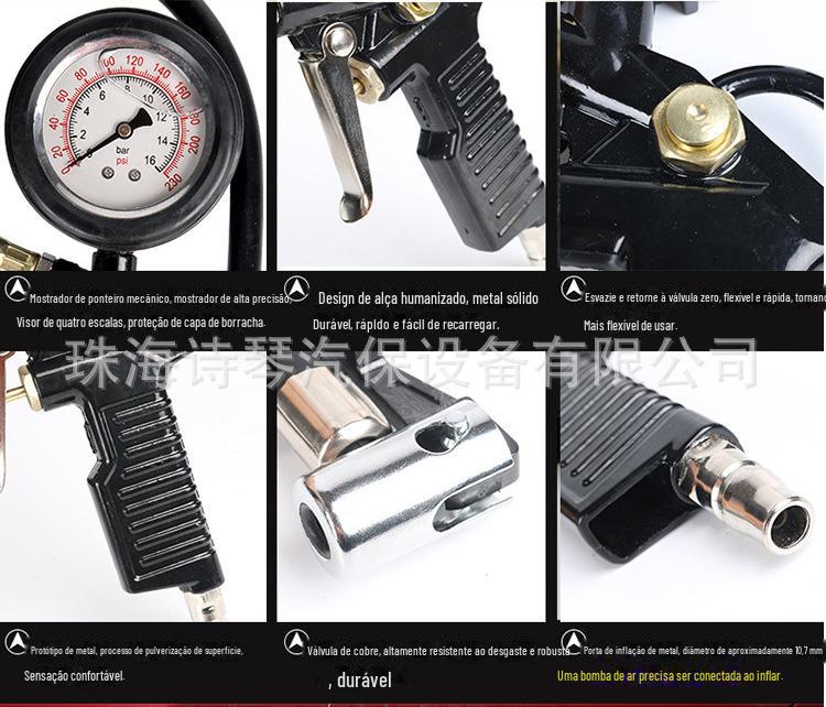 Tem as funções de esvaziar, encher e testar pneus de veículos. Também pode ser conectado a uma bomba de ar e tem a função de soprar poeira nos motores dos veículos.