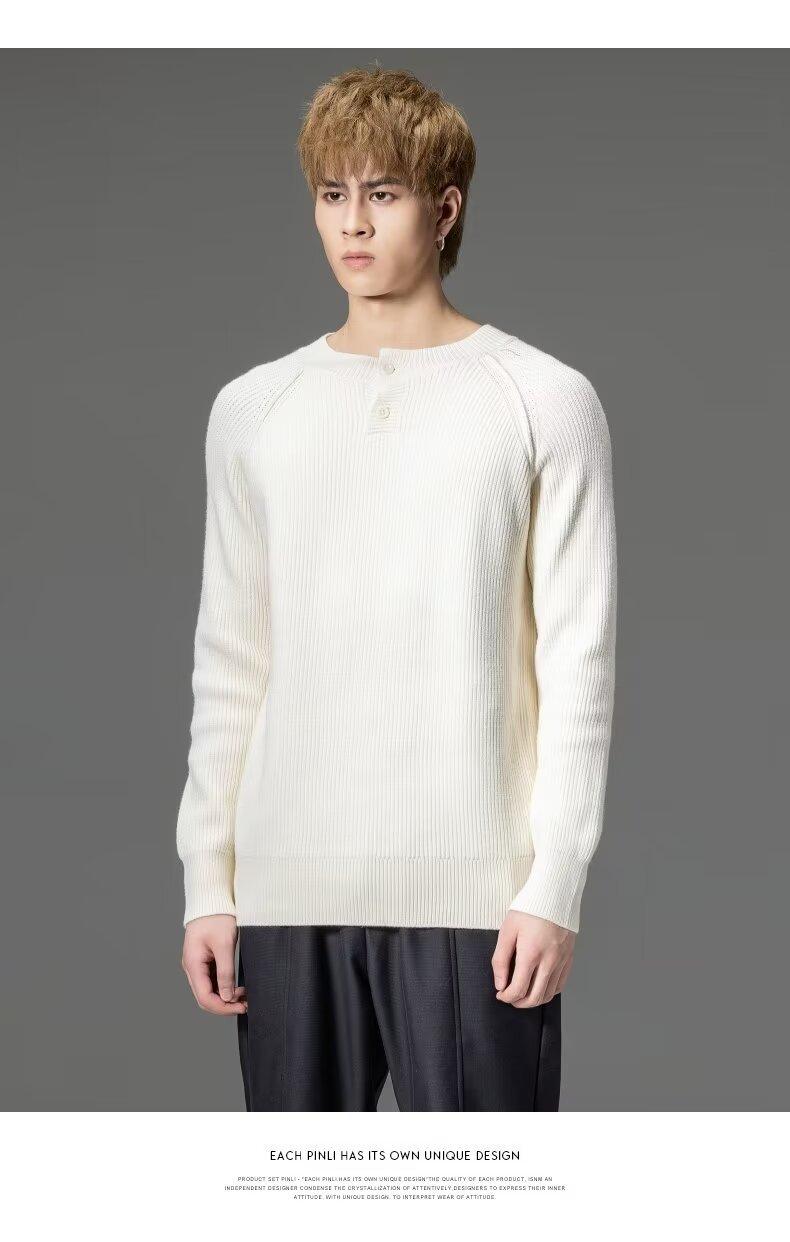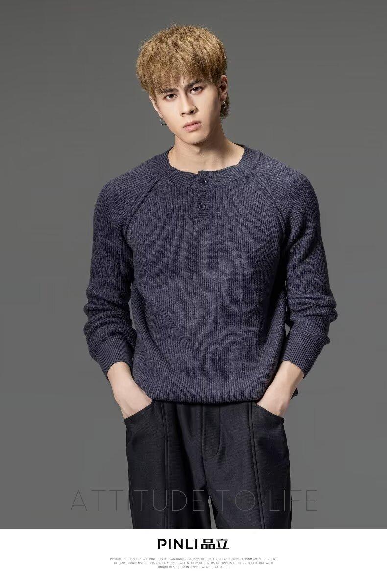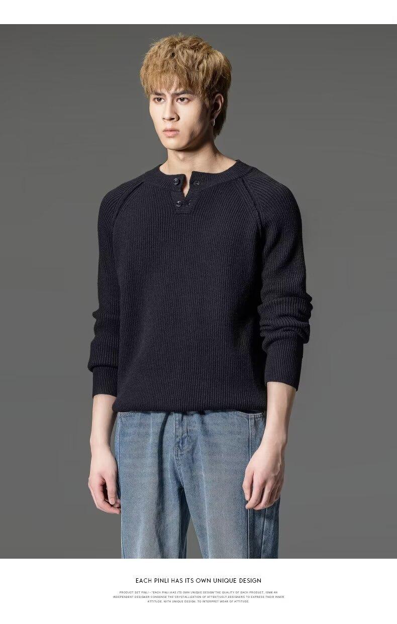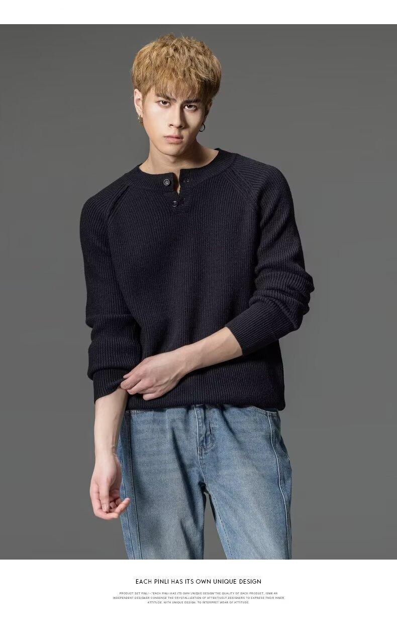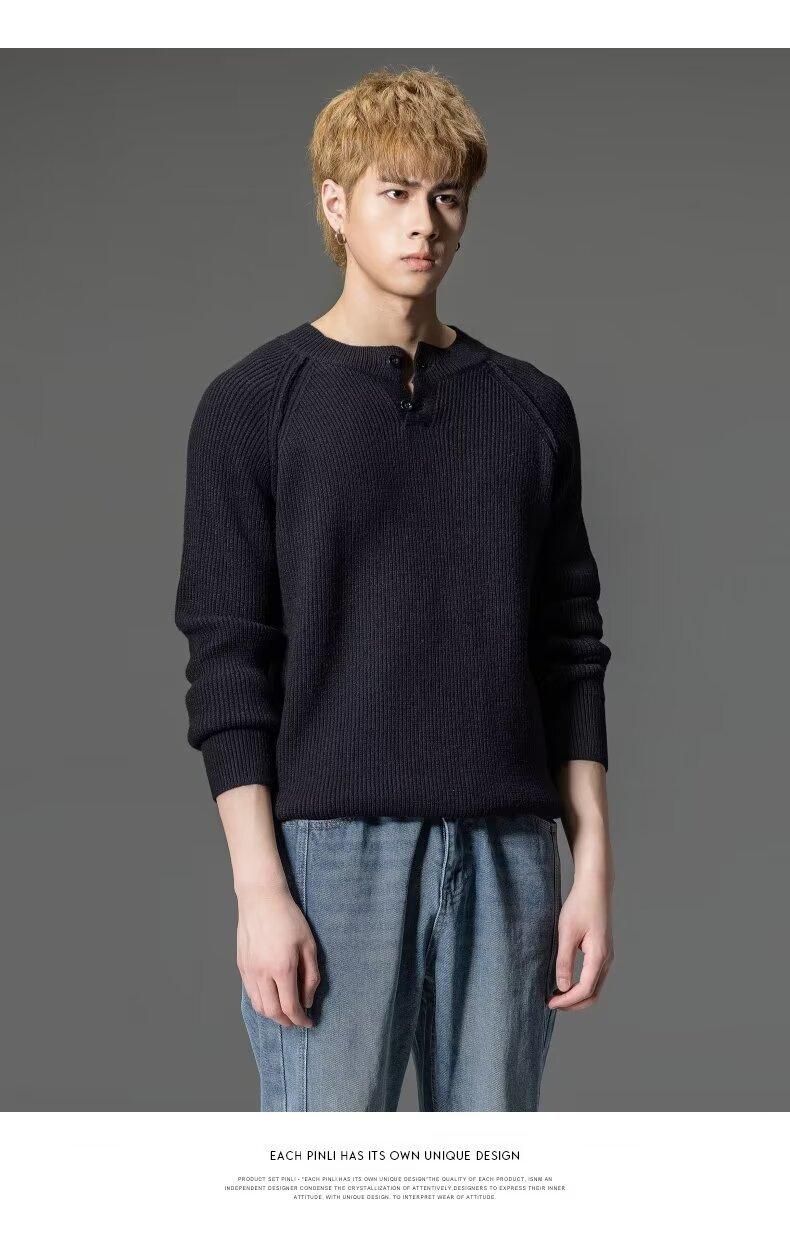 Outono e inverno quente estilo coreano cor sólida casual suéter grosso homens pullover jacquard gola listra fina inferior suéter homens