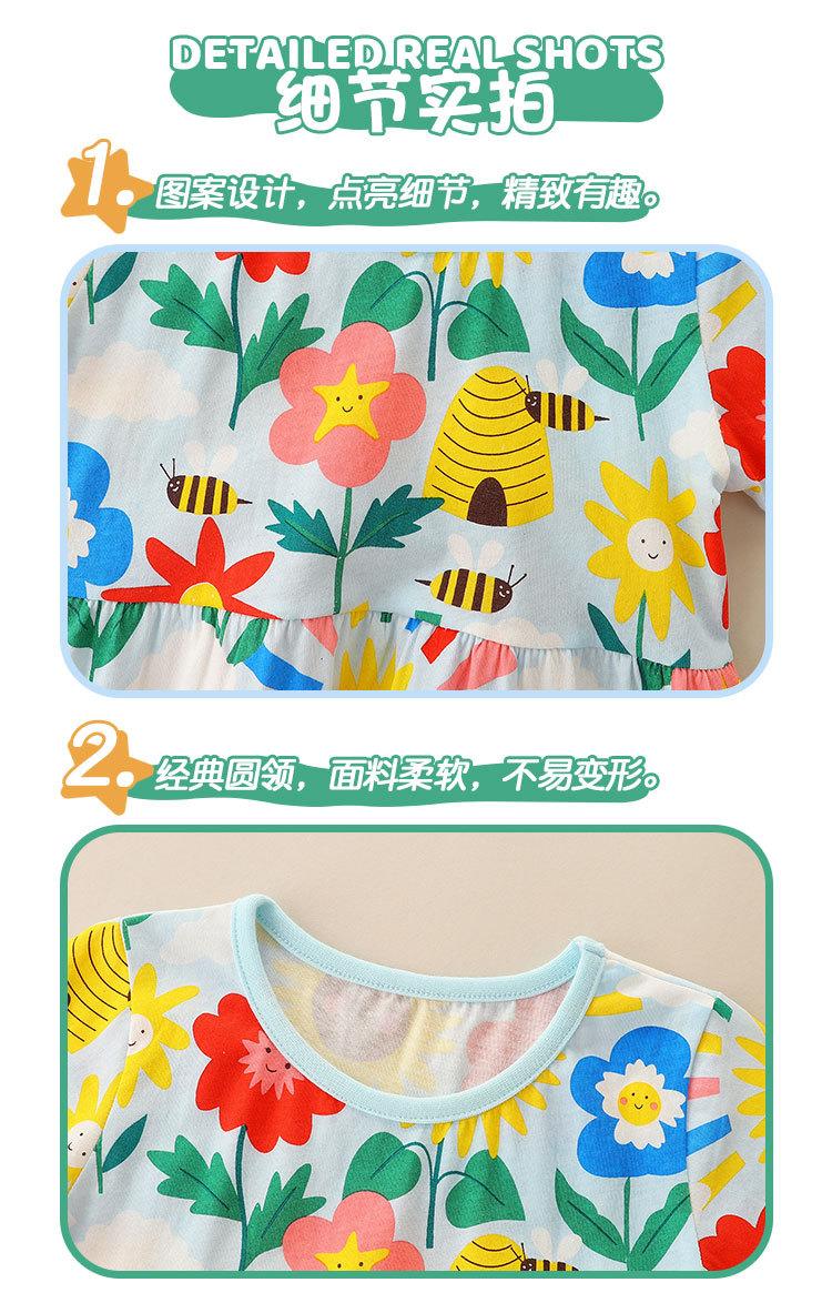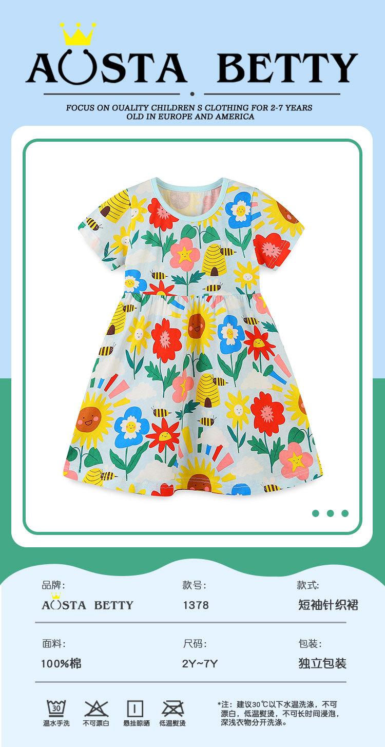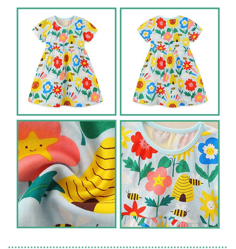 24 novo verão meninas vestido dos desenhos animados animal impressão vestido de princesa em torno do pescoço pulôver de malha de algodão de manga curta vestido infantil