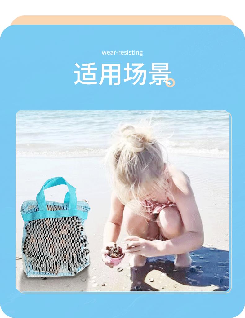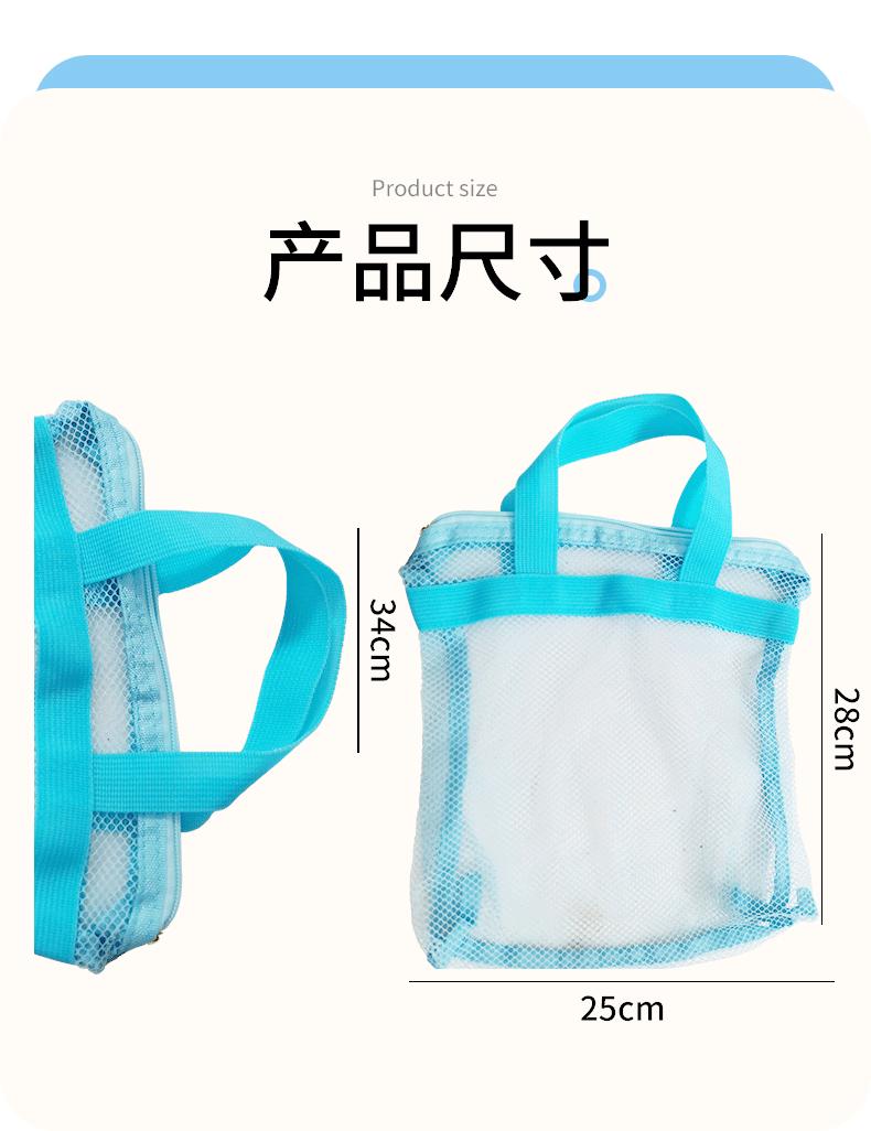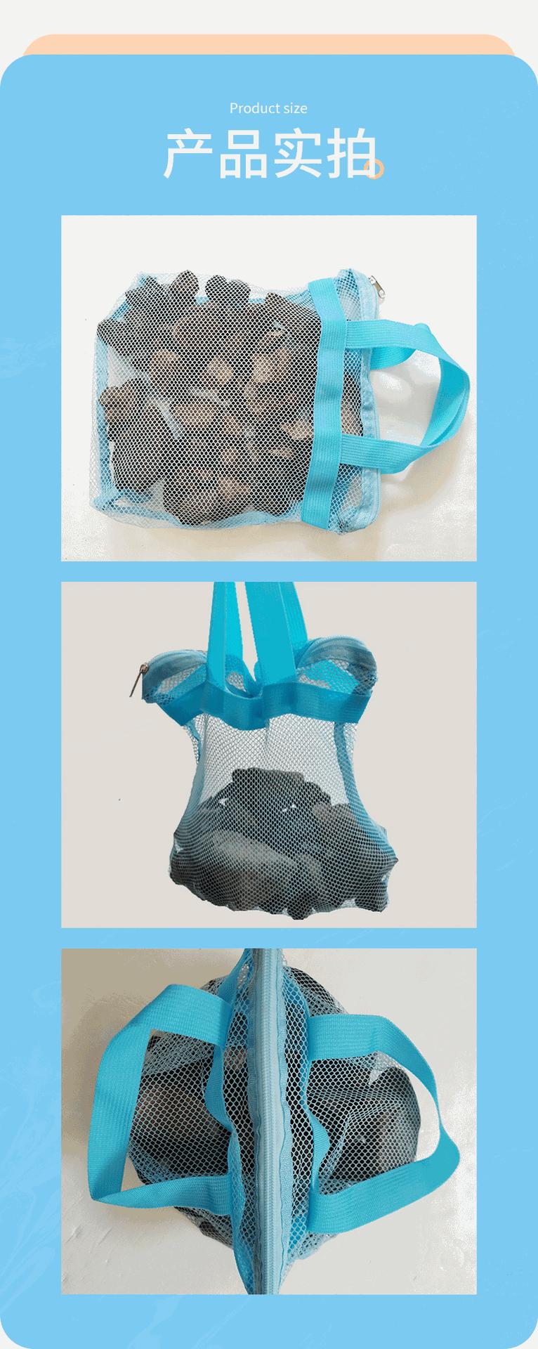 Introdução do produto: As crianças costumam sair para brincar e brincar na praia. Os corações curiosos das crianças inevitavelmente colecionarão muitas coisas. Ferramentas de escavação de areia, toalhas, roupas, brinquedos, etc. estão todos espalhados, o que é muito inconveniente. Esta bolsa de coleção de praia armazena todos eles, e o design da bolsa de malha remove toda a areia e água, e também pode ser usado para guardar ferramentas de escavação de neve no inverno.