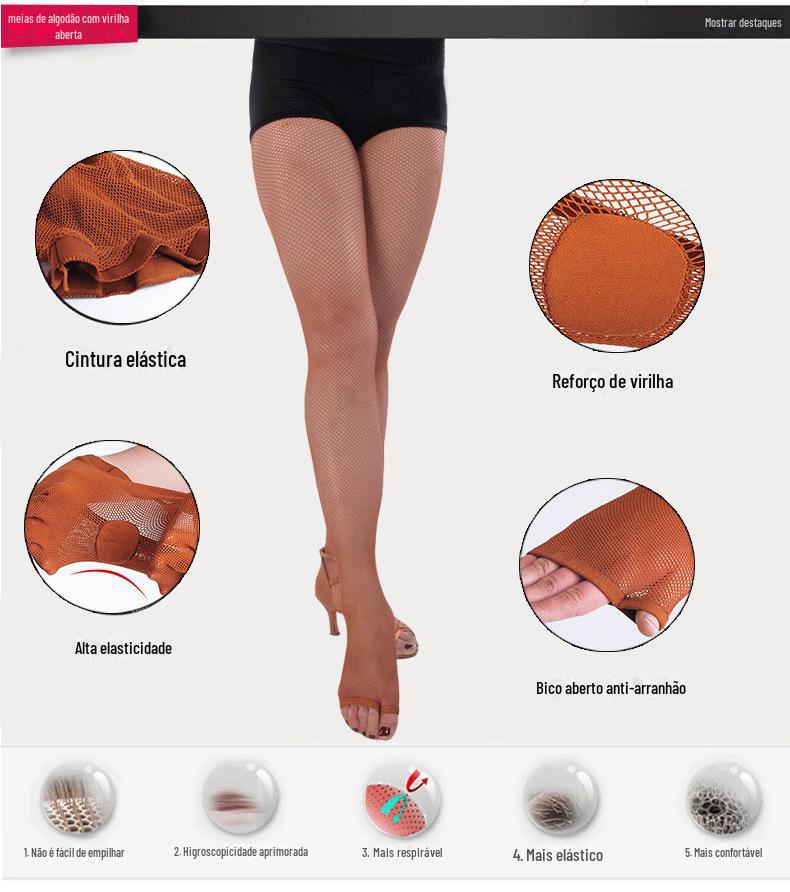 Meia-Calça Pequena de Rede Sem Dedos para Dança Latina Cor Caramelo Virilha de Algodão Meias de Dança Resistentes ao Desgaste Meias de Rede Boca de Peixe 2896